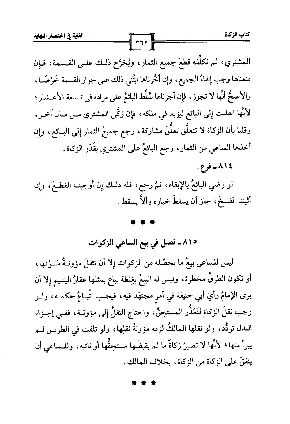 المشتري، لم نكلِّفه قطعَ جميع الثمار، ويُخرَّج ذلك على القسمة، فإِن منعناها وجب إِبقاءُ الجميع، وإن أخَّرناها ابتُني ذلك على جواز القسمة خَرْصًا، والأصحُّ أنَّها لا تجوز، فإِن أجزناها سُلِّط البائعُ على مراده في تسعة الأعشار؛ لأنَّها انقلبت إِلى البائع ليزيد في ملكه، فإِن زكَّى المشتري من مال آخر، وقلنا بأن الزكاة لا تتعلَّق تعلُّقَ مشاركة، رجع جميعُ الثمار إِلى البائع، وإِن أخذها الساعي من الثمار، رجع البائعُ على المشتري بقَدْر الزكاة.