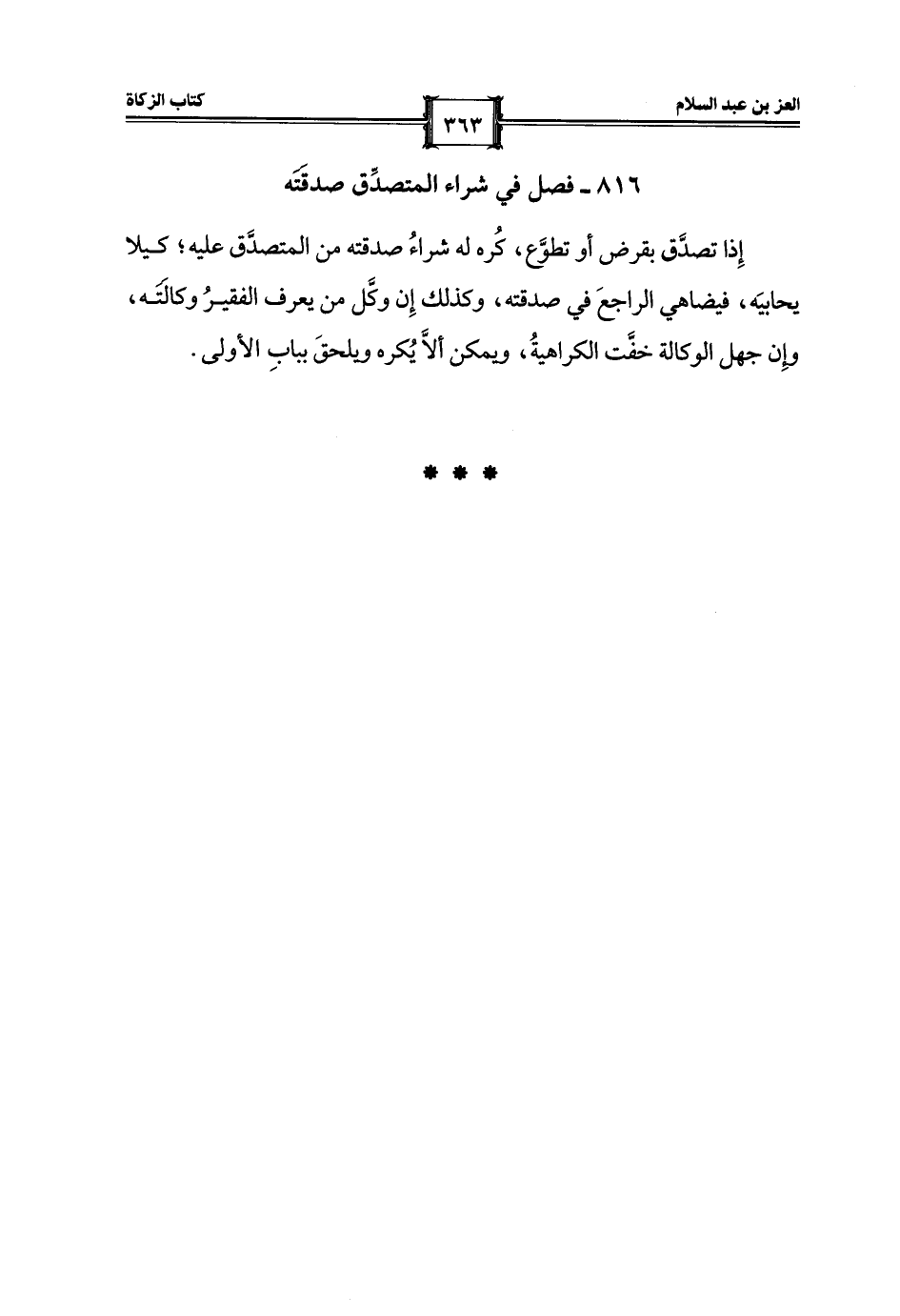إِذا تصدَّق بقرض أو تطوَّع، كُره له شراءُ صدقته من المتصدَّق عليه؛ كيلا يحابيَه، فيضاهي الراجعَ في صدقته، وكذلك إِن وكَّل من يعرف الفقيرُ وكالته، وإن جهل الوكالة خفَّت الكراهيةُ، ويمكن ألَّا يُكره ويلحقَ ببابِ الأولى.