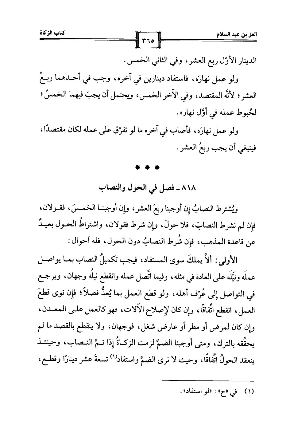 الأولى: ألَّا يملكَ سوى المستفاد، فيجب تكميلُ النصاب بما يواصل عملَه ونيلَه على العادة في مثله، وفيما اتَّصل عمله وانقطع نيلُه وجهان، ويرجع في التواصل إِلى عُرْف أهله، ولو قطع العمل بما يُعدُّ فصلًا؛ فإن نوى قطعَ العمل، انقطع اتِّفاقًا، وإِن كان لإِصلاح الآلات، فهو كالعمل على المعدن، وإِن كان لمرض أو مطر أو عارض شغل، فوجهان، ولا ينقطع بالقصد ما لم يحقِّقه بالترك، ومتى أوجبنا الضمَّ لزمت الزكاةُ إِذا تمَّ النصاب، وحينئذ ينعقد الحولُ اتّفاقًا، وحيث لا نرى الضمَّ واستفاد (¬1) تسعةَ عشر دينارًا وقطع،