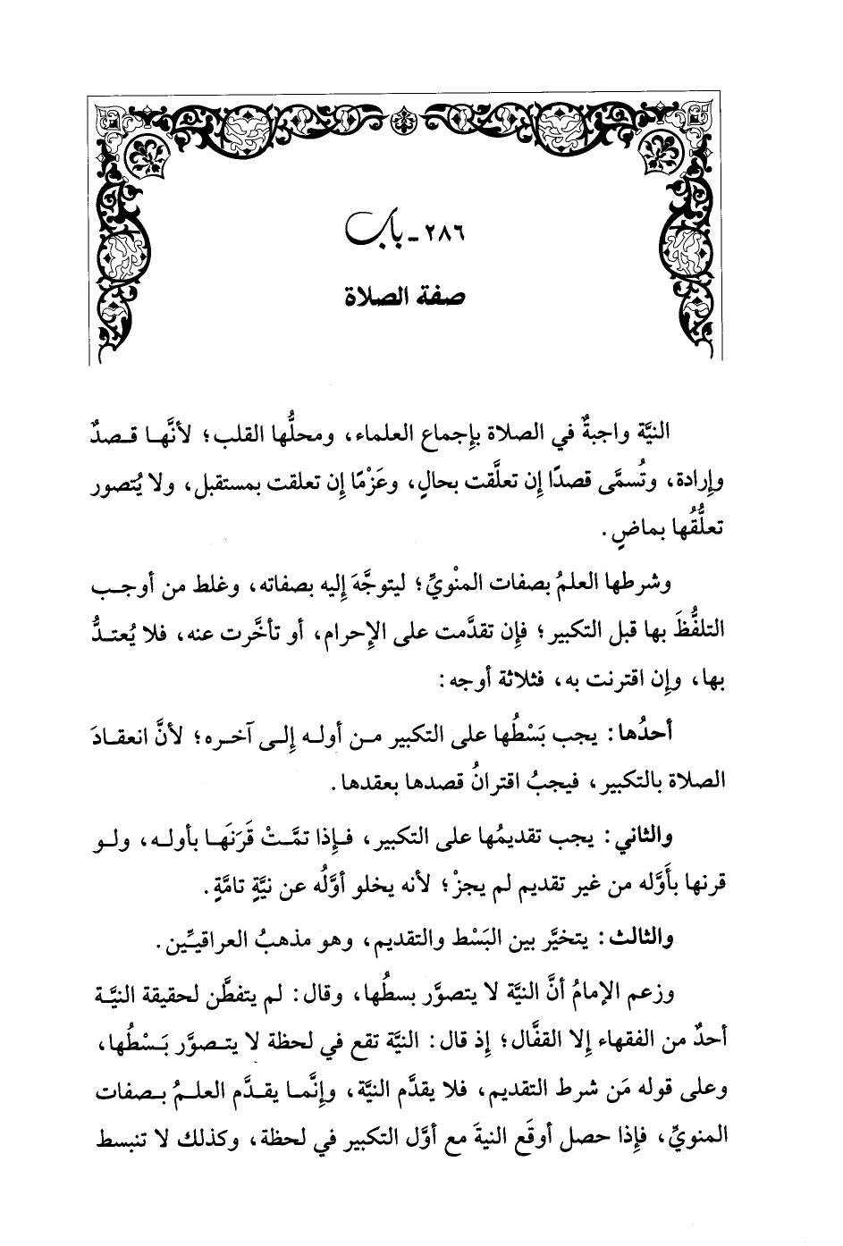 وشرطها العلمُ بصفات المنْويِّ؛ ليتوجَّهَ إِليه بصفاته، وغلط من أوجب التلفُّظَ بها قبل التكبير؛ فإِن تقدَّمت على الإِحرام، أو تأخَّرت عنه، فلا يُعتدُّ بها، وإِن اقترنت به، فثلاثة أوجه: