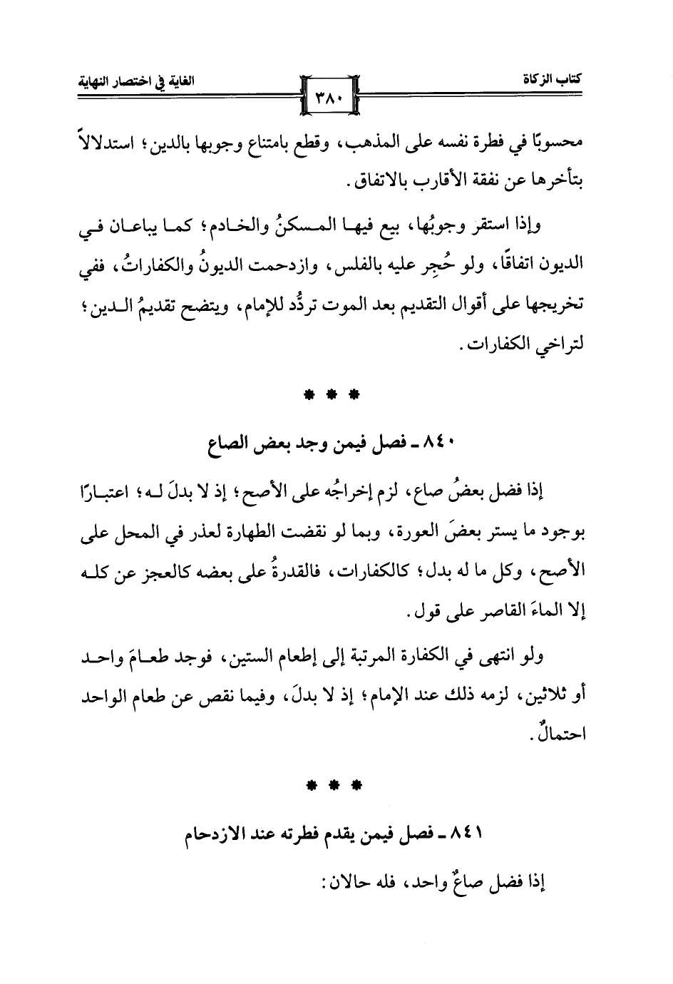 إذا فضل بعضُ صاع، لزم إخراجُه على الأصح؛ إذ لا بدلَ له؛ اعتبارًا بوجود ما يستر بعضَ العورة، وبما لو نقضت الطهارة لعذر في المحل على الأصح، وكل ما له بدل؛ كالكفارات، فالقدرةُ على بعضه كالعجز عن كله إلا الماءَ القاصر على قول.