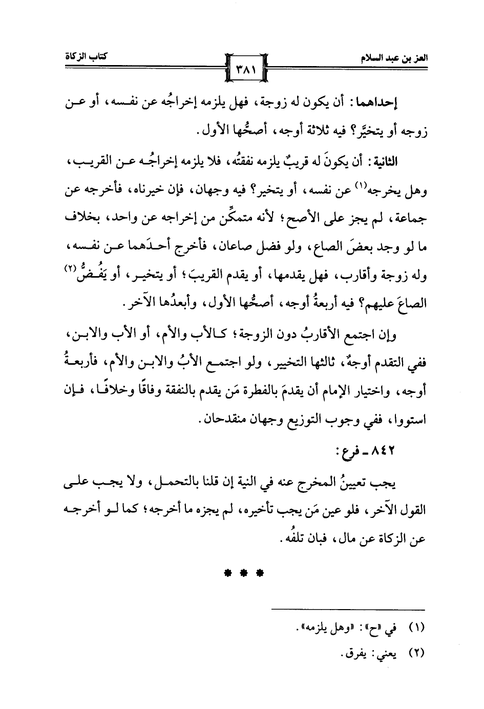 إحداهما: أن يكون له زوجة، فهل يلزمه إخراجُه عن نفسه، أو عن زوجه أو يتخيَّر؟ فيه ثلاثة أوجه، أصحُّها الأول.
