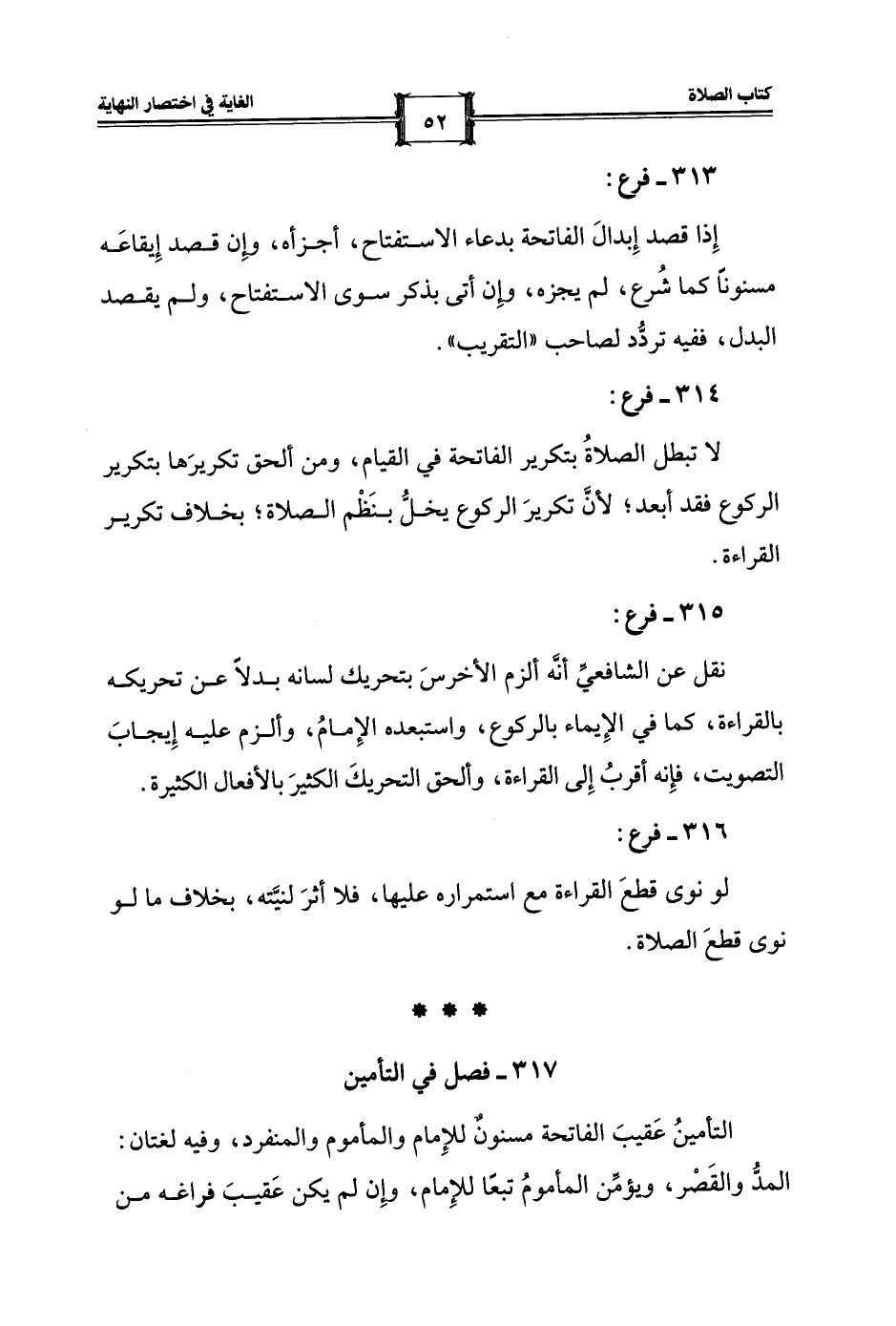 التامينُ عَقيبَ الفاتحة مسنونٌ للإِمام والمأموم والمنفرد، وفيه لغتان: المدُّ والقَصْر، ويؤمِّن المأمومُ تبعًا للإِمام، وإِن لم يكن عَقيبَ فراغه من