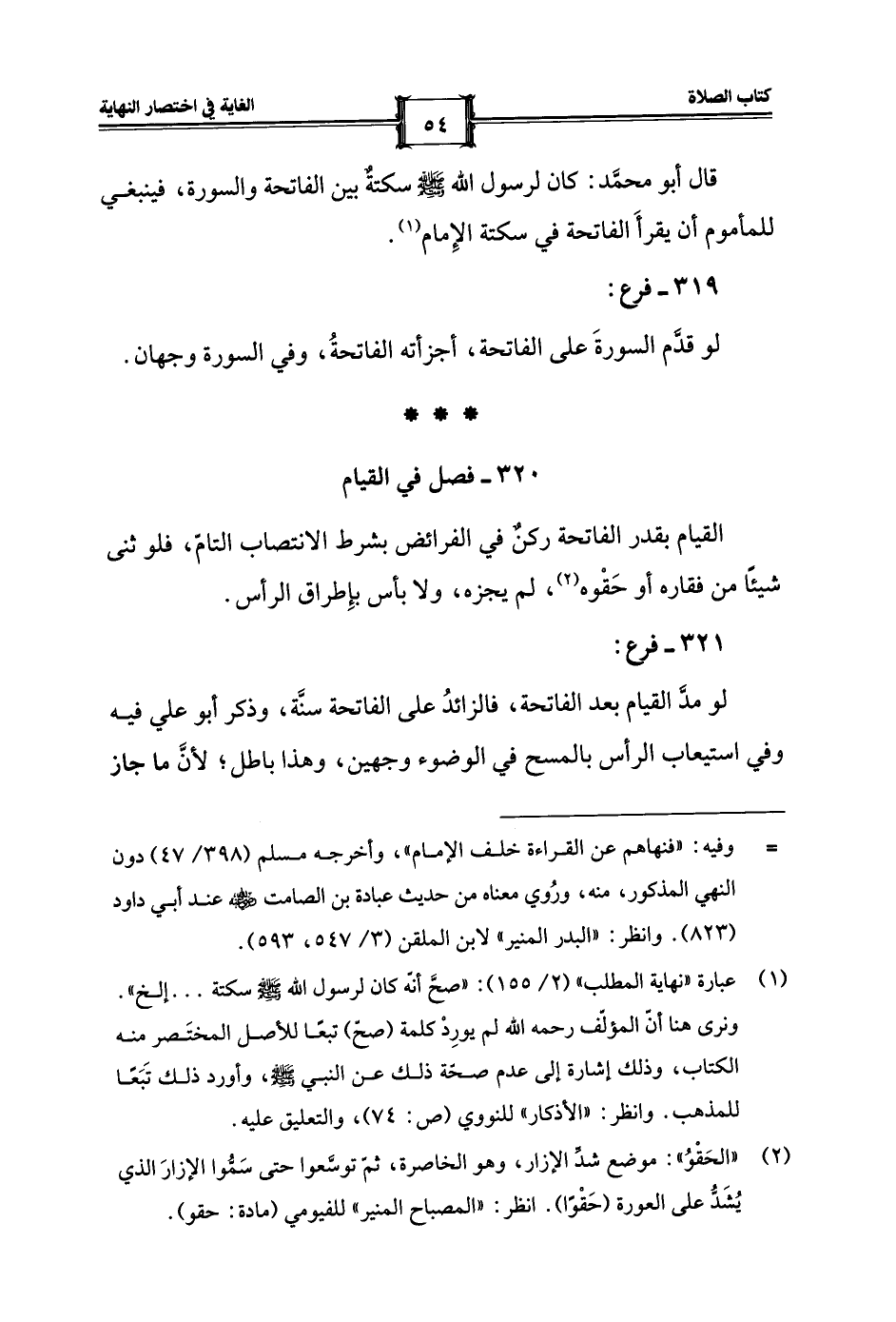 (¬1) عبارة "نهاية المطلب" (2/ 155): "صحَّ أنه كان لرسول الله - صلى الله عليه وسلم - سكتة ... إلخ". ونرى هنا أنّ المؤلف رحمه الله لم يورِدْ كلمة (صحّ) تبعًا للأصل المختَصر منه الكتاب، وذلك إشارة إلى عدم صحّة ذلك عن النبي - صلى الله عليه وسلم -، وأورد ذلك تَبَعًا للمذهب. وانظر: "الأذكار" للنووي (ص: 74)، والتعليق عليه.