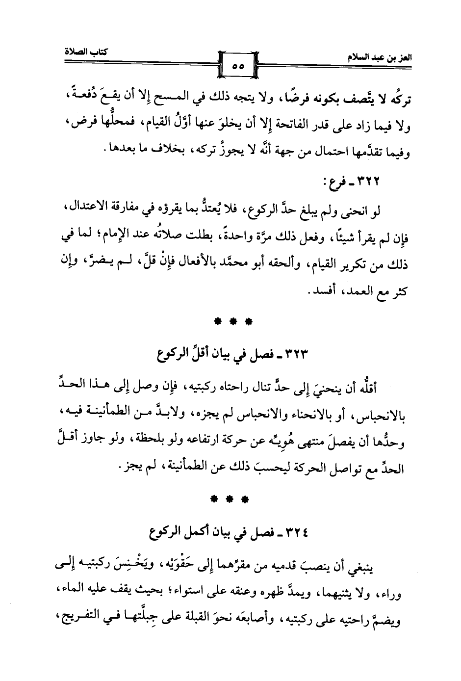 أقلُّه أن ينحنيَ إِلى حدٍّ تنال راحتاه ركبتيه، فإِن وصل إِلى هذا الحدِّ بالانحباس، أو بالانحناء والانحباس لم يجزه، ولابدَّ من الطمأنينة فيه، وحدُّها أن يفصلَ منتهى هُوِيِّه عن حركة ارتفاعه ولو بلحظة، ولو جاوز أقلَّ الحدِّ مع تواصل الحركة ليحسبَ ذلك عن الطمأنينة، لم يجز.