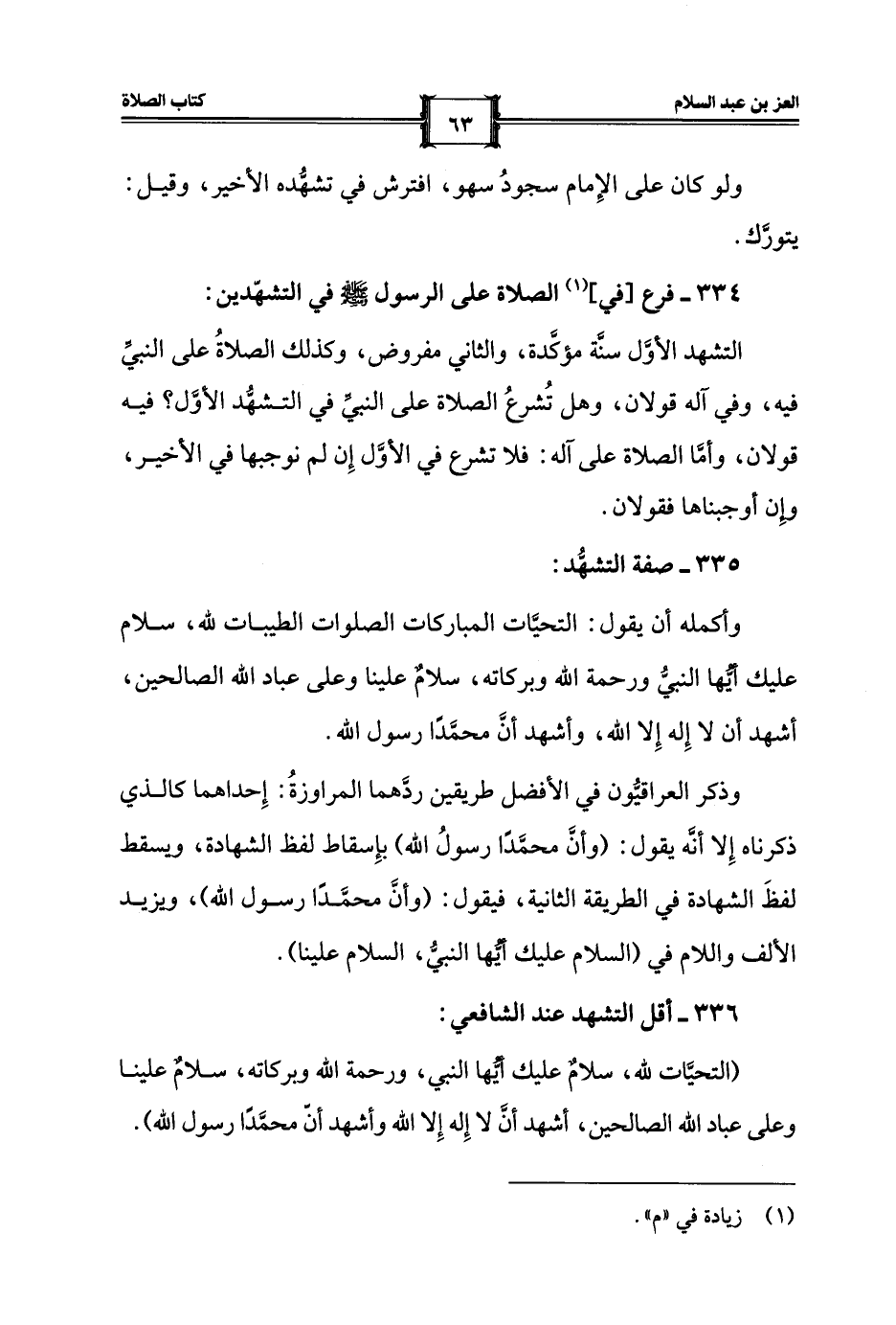 التشهد الأوَّل سنَّة مؤكَّدة، والثاني مفروض، وكذلك الصلاةُ على النبيِّ فيه، وفي آله قولان، وهل تُشرعُ الصلاة على النبيِّ في التشهُّد الأوَّل؟ فيه قولان، وأمَّا الصلاة على آله: فلا تشرع في الأوَّل إِن لم نوجبها في الأخير، وإن أوجبناها فقولان.