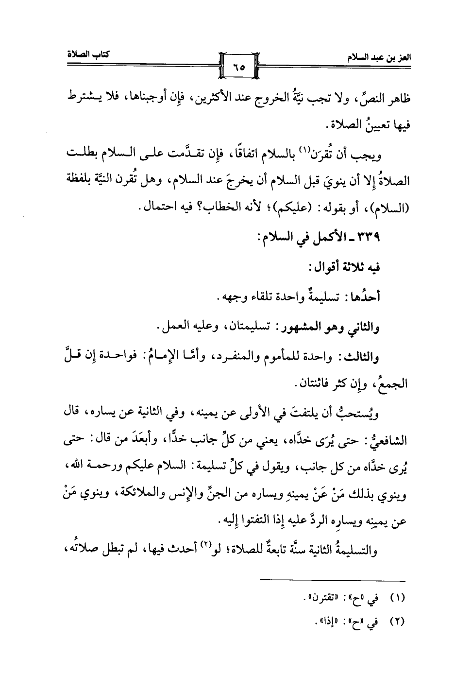 ويجب أن تُقرَن (¬1) بالسلام اتفاقًا، فإِن تقدَّمت على السلام بطلت الصلاةُ إِلا أن ينويَ قبل السلام أن يخرجَ عند السلام، وهل تُقرن النيَّة بلفظة (السلام)، أو بقوله: (عليكم)؛ لأنه الخطاب؟ فيه احتمال.