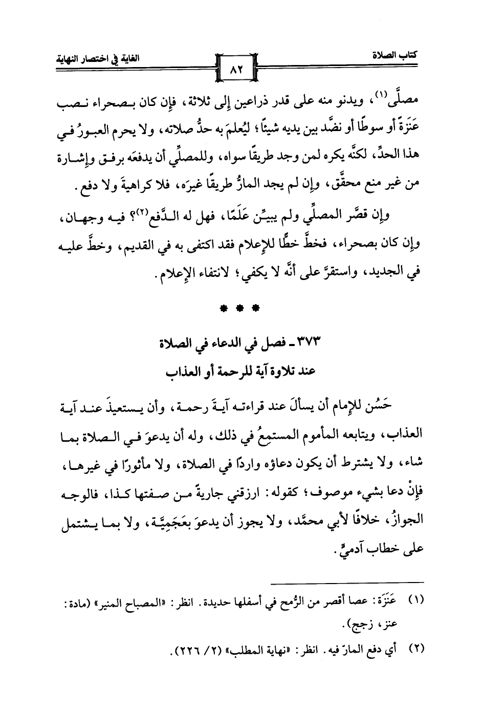 مصلَّى (¬1)، ويدنو منه على قدر ذراعين إِلى ثلاثة، فإِن كان بصحراء نصب عَنَزةً أو سوطًا أو نضَّد بين يديه شيئًا؛ ليُعلمَ به حدُّ صلاته، ولا يحرم العبورُ في هذا الحدِّ، لكنَّه يكره لمن وجد طريقًا سواه، وللمصلِّي أن يدفعَه برفق وإِشارة من غير منع محقَّق، وإِن لم يجد المارُّ طريقًا غيرَه، فلا كراهيةَ ولا دفع.