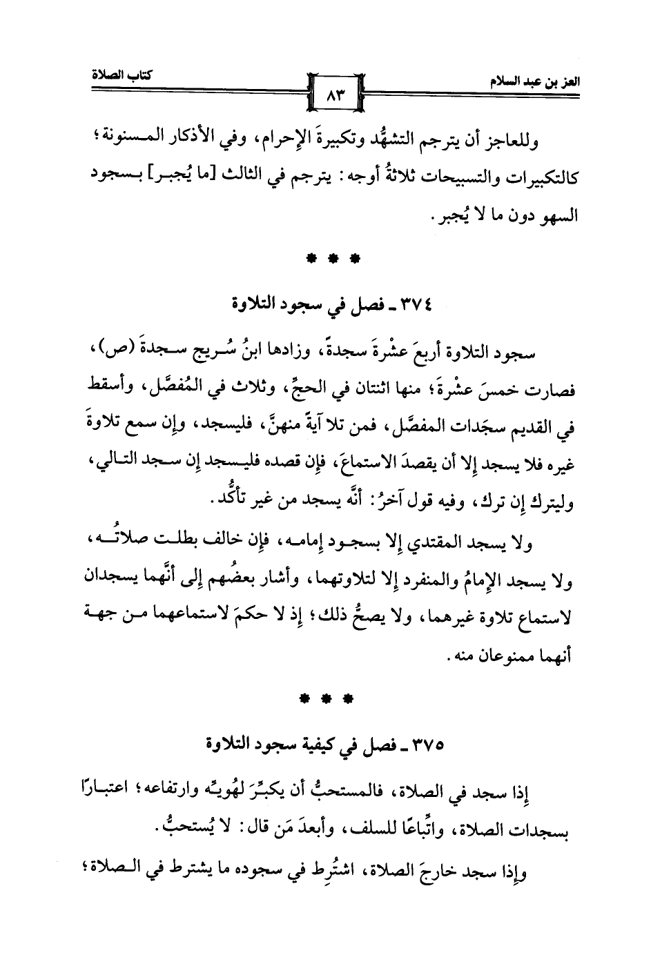 سجود التلاوة أربعَ عشْرةَ سجدةً، وزادها ابن سُريج سجدةَ (ص)، فصارت خمسَ عشْرةَ؛ منها اثنتان في الحجِّ، وثلاث في المُفصَّل، وأسقط في القديم سجَدات المفصَّل، فمن تلا آيةً منهنَّ، فليسجد، وإِنْ سمع تلاوةَ غيره فلا يسجد إِلا أن يقصدَ الاستماعَ، فإِن قصده فليسجد إِن سجد التالي، وليترك إِن ترك، وفيه قول آخرُ: أنَّه يسجد من غير تأكُّد.