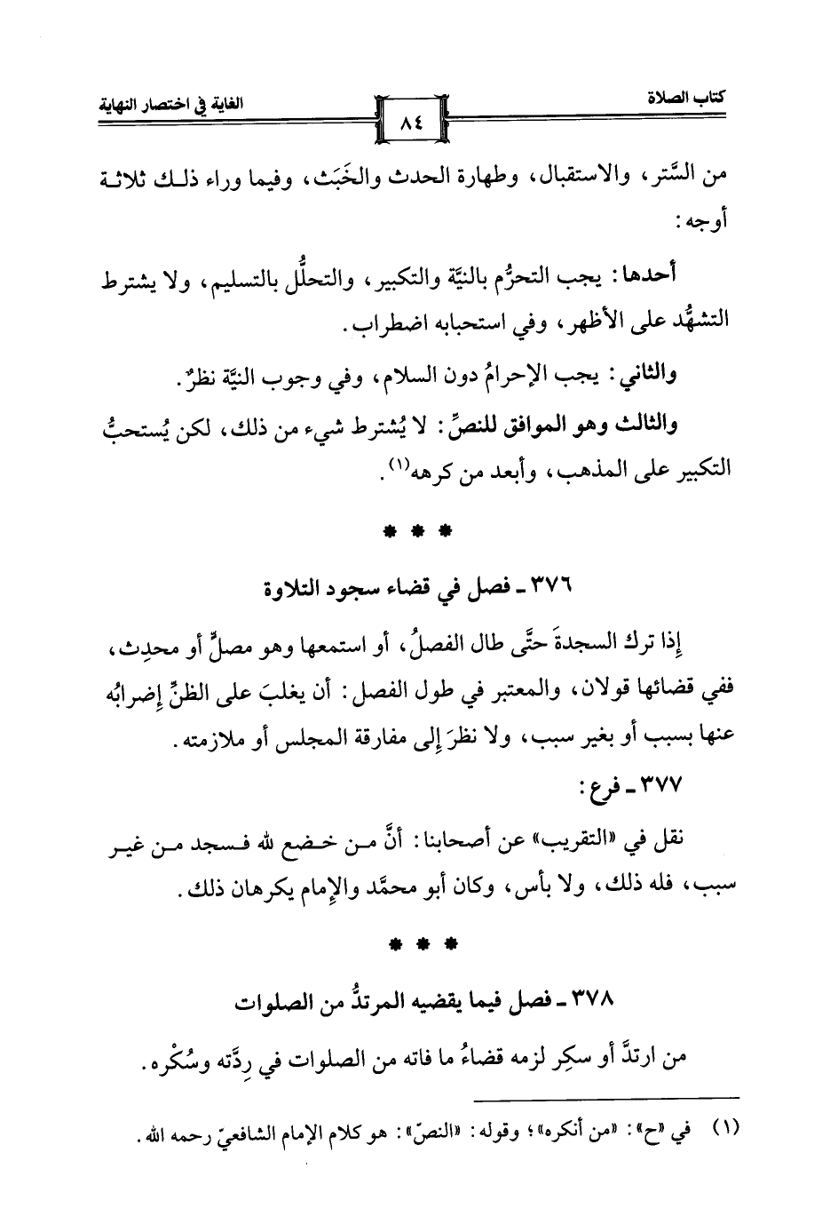 من السَّتر، والاستقبال، وطهارة الحدث والخَبَث، وفيما وراء ذلك ثلاثة أوجه: