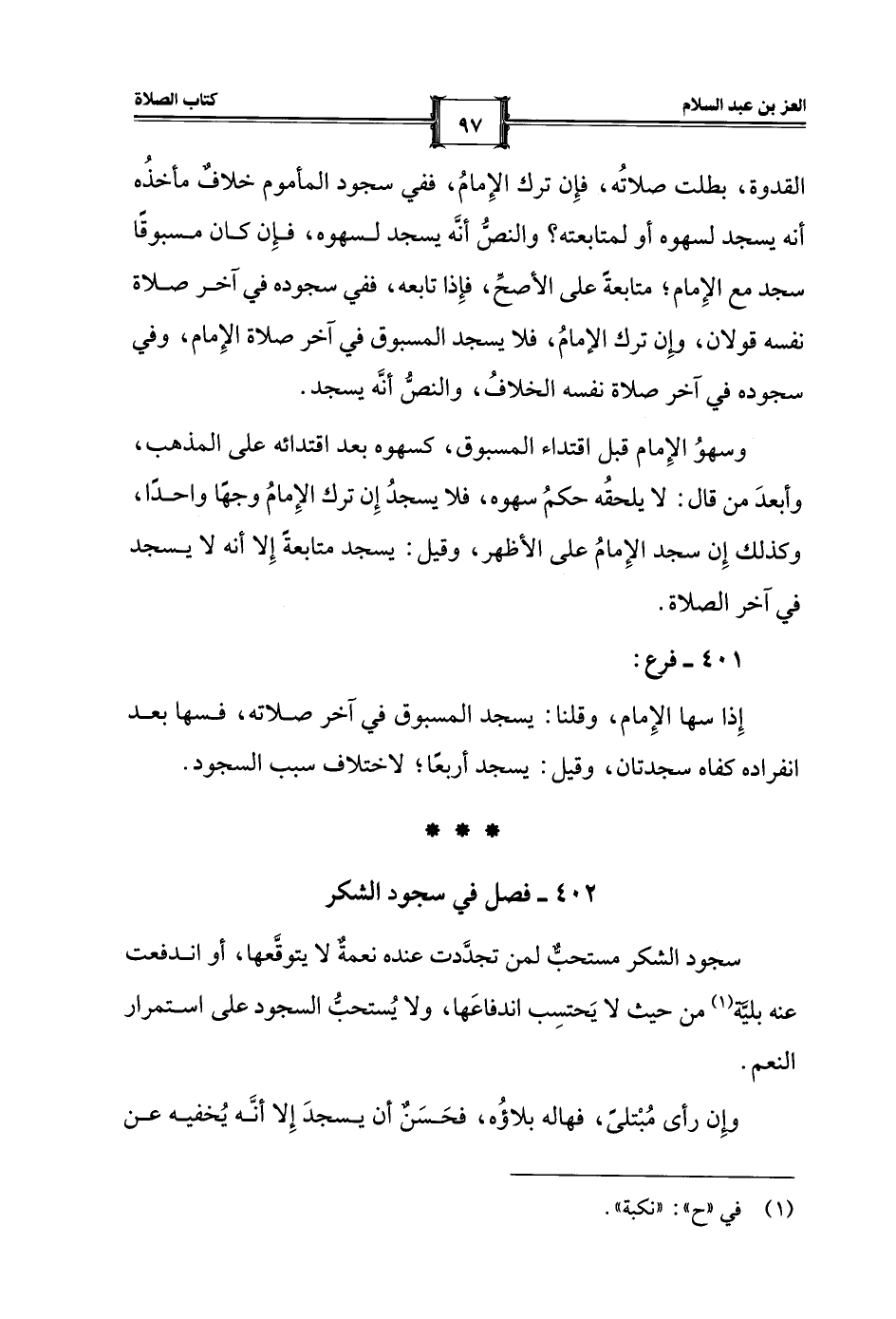 سجود الشكر مستحبٌّ لمن تجدَّدت عنده نعمةٌ لا يتوقَّعها، أو اندفعت عنه بليَّة (¬1) من حيث لا يَحتسِب اندفاعَها، ولا يُستحبُّ السجود على استمرار النعم.