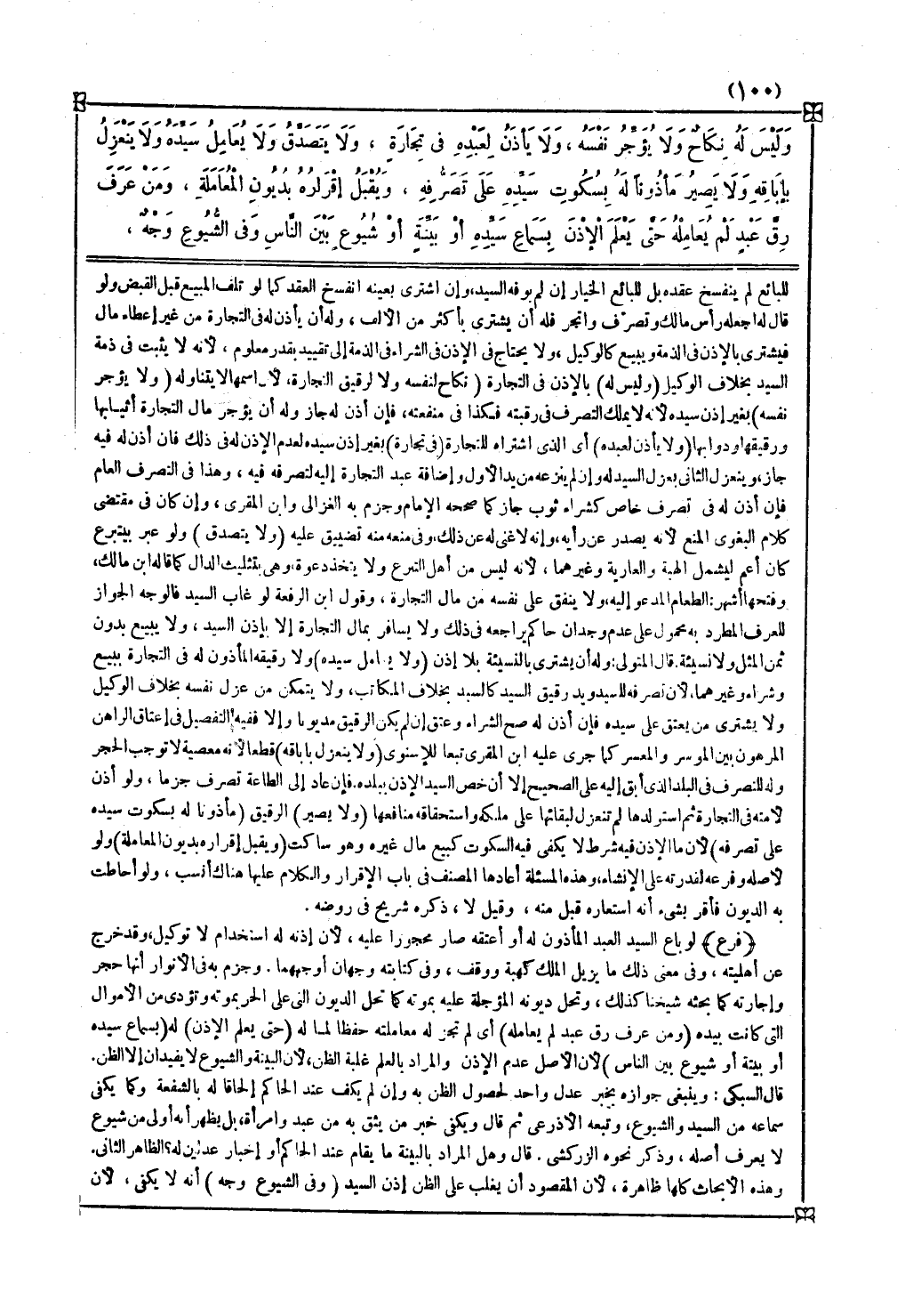ولا يحتاج في الإذن في الشراء في الذمة إلى تقييد بقدر معلوم لأنه لا يثبت في ذمة السيد بخلاف الوكيل