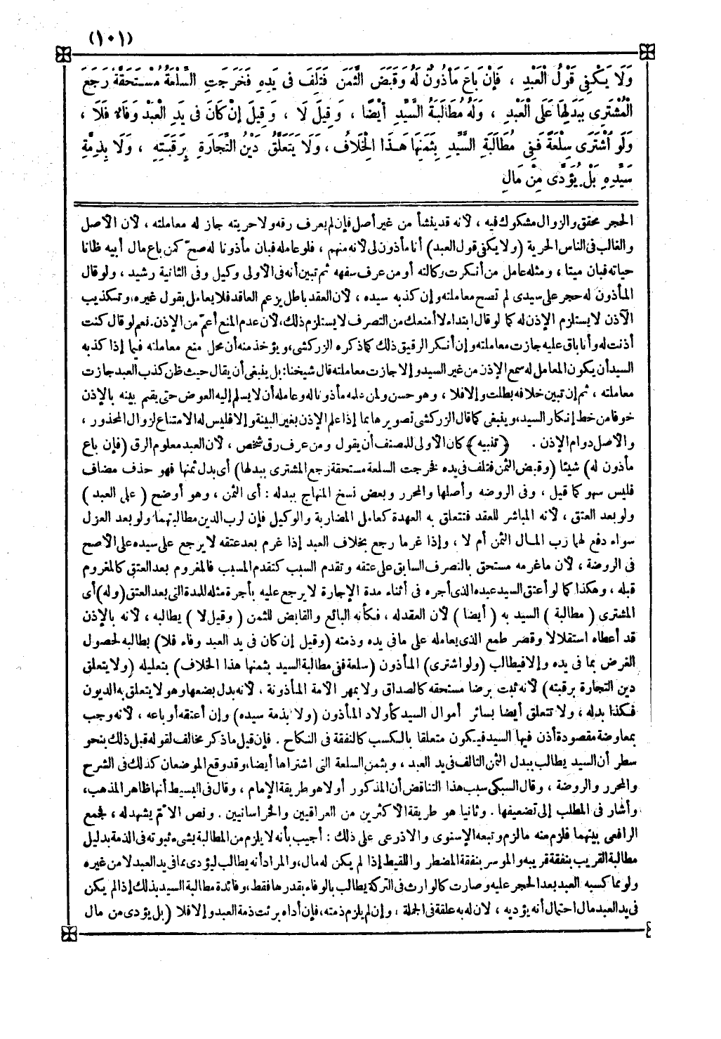 ( وقيل لا ) يطالبه لأنه بالإذن قد أعطاه استقلالا وقصر طمع الذي يعامله على ما في يده وذمته