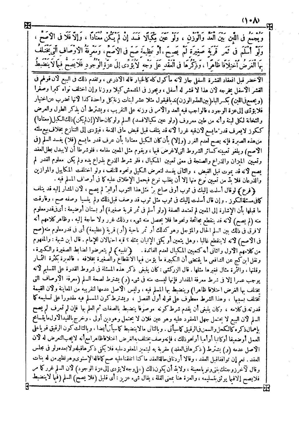 ( ولو عين مكيالا فسد ) السلم ولو كان حالا ( إن لم يكن ) ذلك الكيل ( معتادا ) ككوز لا يعرف قدر ما يسع لأن فيه غررا لأنه قد يتلف قبل قبض ما في الذمة فيؤدي إلى التنازع بخلاف بيع ملئه من هذه الصبرة فإنه يصح لعدم الغرر