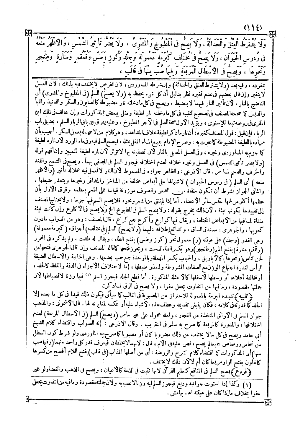 وصرح الإمام ببيع الماء المغلي بمثله فيصح السلم فيه وفي ماء الورد لأن ناره لطيفة كما جزم به الماوردي وغيره وفي العسل المصفى بالنار لأن تصفيته بها لا تؤثر لأن ناره لطيفة للتمييز وإن أفهم قوله ( ولا يضر تأثير الشمس ) في العسل وغيره خلافه لعدم اختلافه فيجوز السلم في المصفى بهما