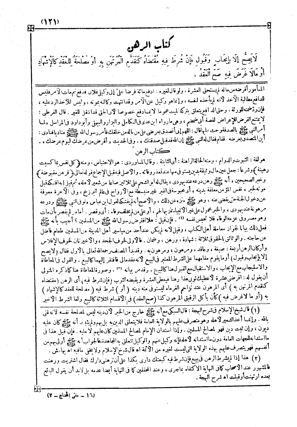والأصل فيه قبل الإجماع قوله تعالى {فرهان مقبوضة} وخبر الصحيحين أنه صلى الله عليه وسلم رهن درعه عند يهودي يقال له أبو الشحم على ثلاثين صاعا من شعير لأهله ثم قيل إنه افتكه قبل موته لخبر نفس المؤمن معلقة بدينه أي محبوسة في القبر غير منبسطة مع الأرواح في عالم البرزخ وفي الآخرة معوقة عن دخول الجنة حتى يقضى عنه وهو صلى الله عليه وسلم منزه عن ذلك