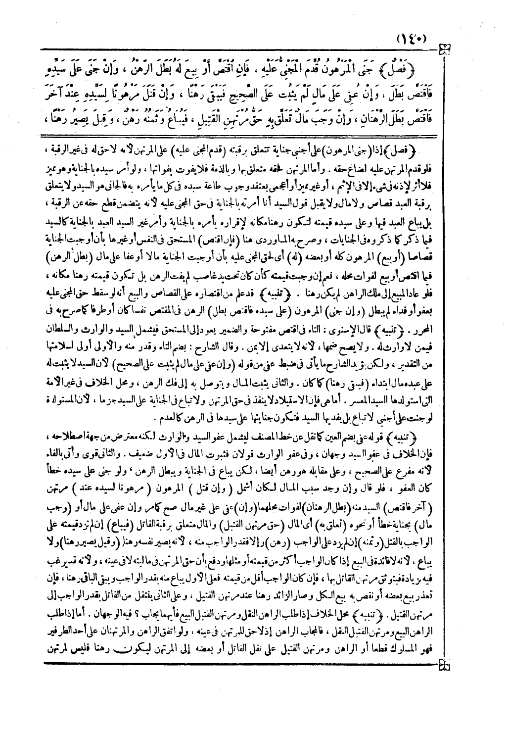فصل إذا (جنى المرهون) على أجنبي جناية تتعلق برقبته (قدم المجني عليه) على المرتهن لأنه لا حق له في غير الرقبة فلو قدم المرتهن عليه لضاع حقه
