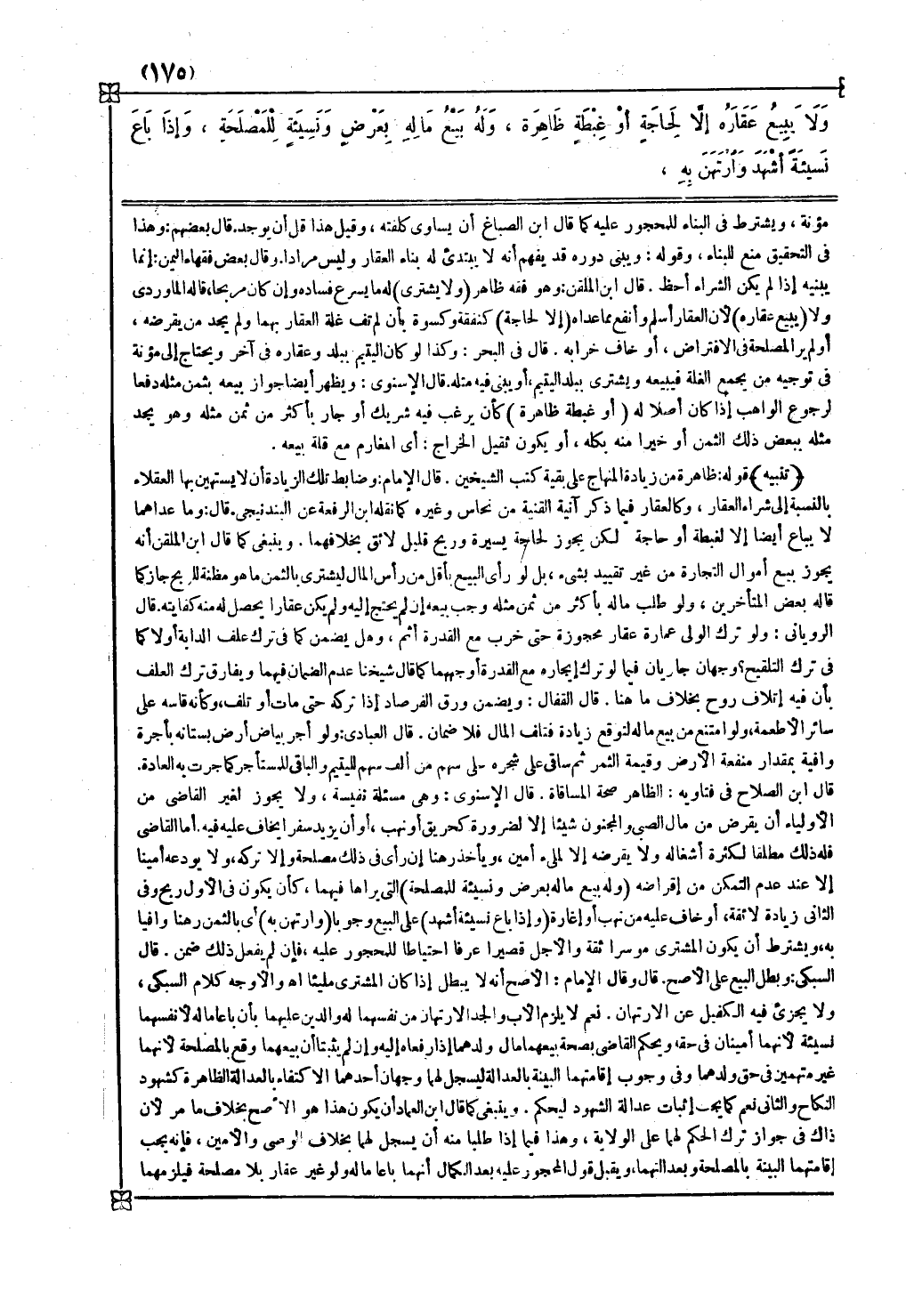 وينبغي كما قال ابن الملقن أنه يجوز بيع أموال التجارة من غير تقييد بشيء بل لو رأى البيع بأقل من رأس المال ليشتري بالثمن ما هو مظنة للربح جاز كما قاله بعض المتأخرين ولو طلب ماله بأكثر من ثمن مثله وجب بيعه إن لم يحتج إليه ولم يكن عقارا يحصل له منه كفايته