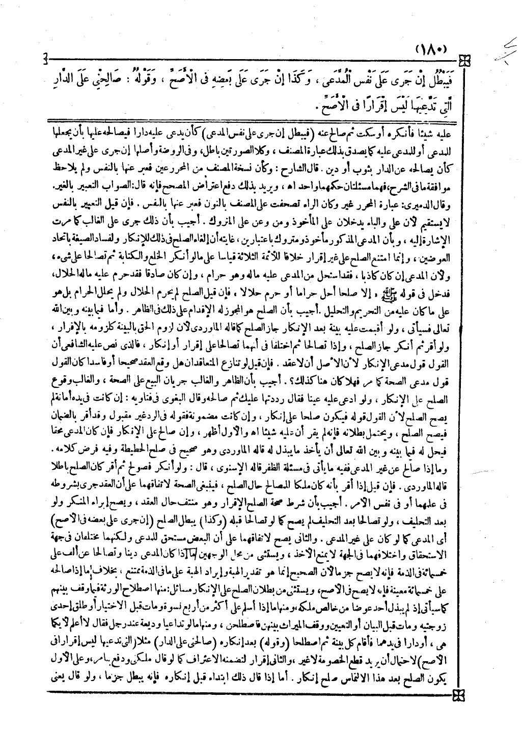فإن قيل لو تنازع المتعاقدان هل وقع العقد صحيحا أو فاسدا كان القول قول مدعي الصحة كما مر فهلا كان هنا كذلك أجيب بأن الظاهر والغالب جريان البيع على الصحة والغالب وقوع الصلح على الإنكار ولو ادعى عليه عينا فقال رددتها عليك ثم صالحه وقال البغوي في فتاويه إن كانت في يده أمانة لم يصح الصلح لأن القول قوله فيكون صلحا على إنكار وإن كانت مضمونة فقوله في الرد غير مقبول وقد أقر بالضمان فيصح الصلح ويحتمل بطلانه فإنه لم يقر أن عليه شيئا اه