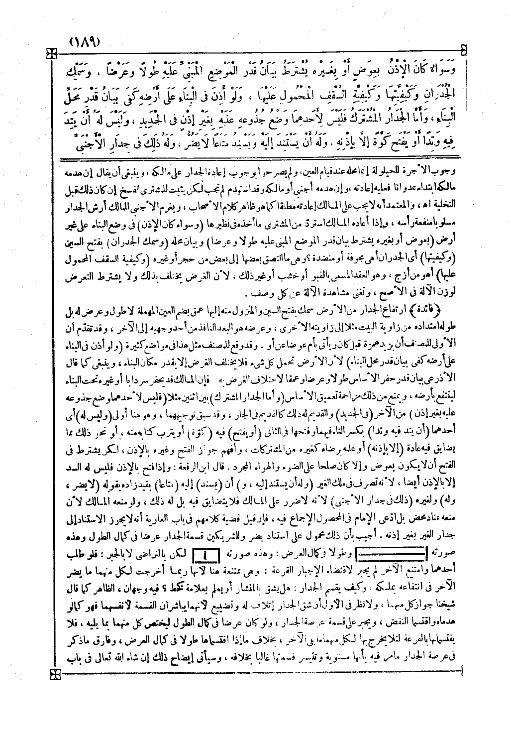 فائدة ارتفاع الجدار من الأرض سمك بفتح السين والمنزول منه إليها عمق بضم العين المهملة لا طول وعرض له بل طوله امتداده من زاوية البيت مثلا إلى زاويته الأخرى وعرضه هو البعد النافذ من أحد وجهيه إلى الآخر