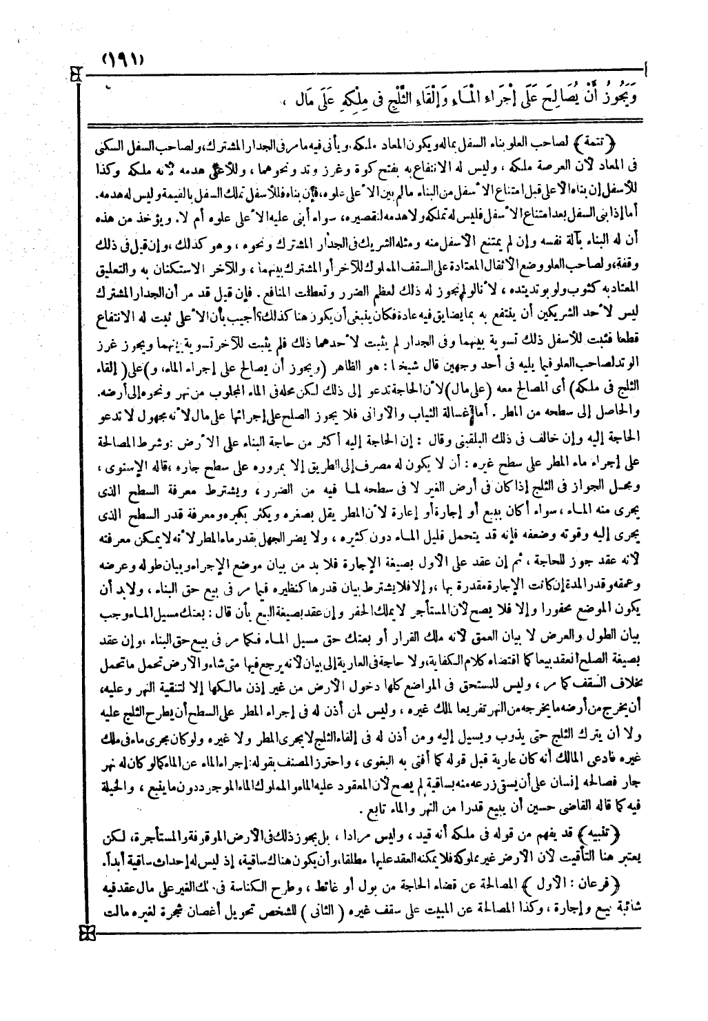 فرعان الأول المصالحة عن قضاء الحاجة من بول أو غائط وطرح الكناسة في ملك الغير على مال عقد فيه شائبة بيع وإجارة وكذا المصالحة عن المبيت على سقف غيره