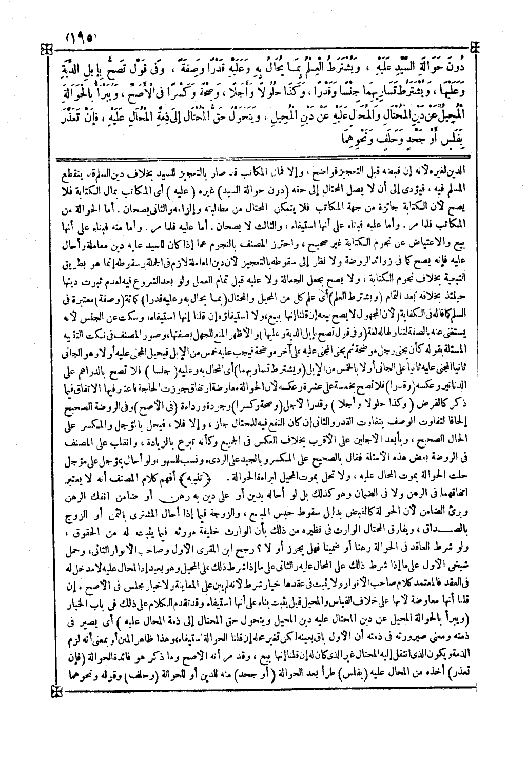 ولو شرط العاقد في الحوالة رهنا أو ضمينا فهل يجوز أو لا رجح ابن المقري الأول وصاحب الأنوار الثاني وحمل شيخي الأول على ما إذا شرط ذلك على المحال عليه والثاني على ما إذا شرط ذلك على المحيل وهو بعيد إذ المحال عليه لا مدخل له في العقد فالمعتمد كلام صاحب الأنوار