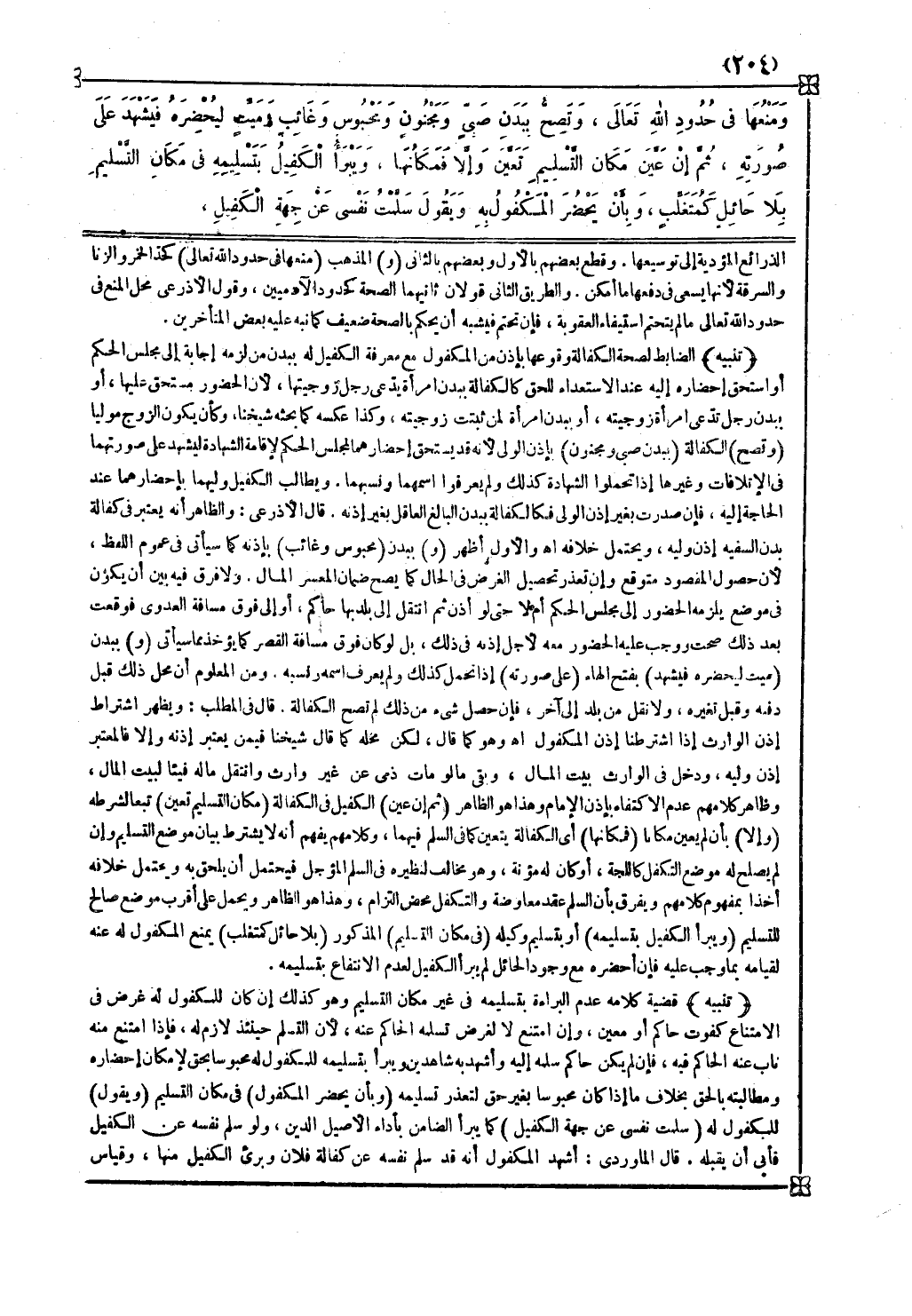 تنبيه الضابط لصحة الكفالة وقوعها بإذن من المكفول مع معرفة الكفيل له ببدن من لزمه إجابة إلى مجلس الحكم أو استحق إحضاره إليه عند الاستعداء للحق كالكفالة ببدن امرأة يدعي رجل زوجيتها لأن الحضور مستحق عليها أو ببدن رجل تدعي امرأة زوجيته أو ببدن امرأة لمن ثبتت زوجيته وكذا عكسه كما بحثه شيخنا وكأن يكون الزوج موليا