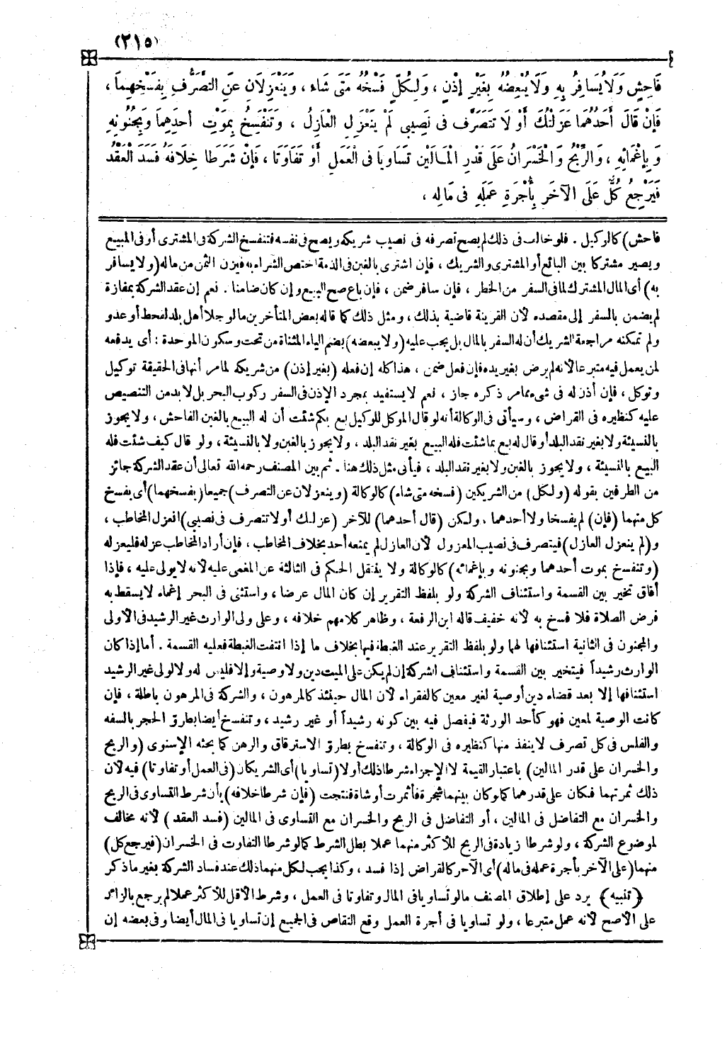 ومثل ذلك كما قاله بعض المتأخرين ما لو جلا أهل بلد لقحط أو عدو ولم تمكنه مراجعة الشريك أن له السفر بالمال بل يجب عليه