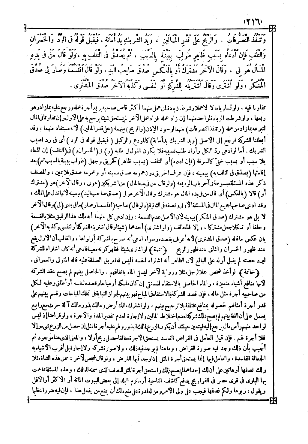 خاتمة لو أخذ شخص جملا لرجل مثلا وراوية لآخر ليسقي الماء باتفاقهم والحاصل بينهم لم يصح عقد الشركة لأنها منافع أشياء متميزة والماء الحاصل بالاستيقاء للمستقي إن كان ملكه أو مباحا وقصده لنفسه أو أطلق وعليه لكل من صاحبيه أجرة مثل ماله فإن قصد الشركة بالاستقاء في المباح فهو بينهم لجواز النيابة في تملك المباحات وقسم بينهم على قدر أجرة أمثالهم لحصوله بمنافع مختلفة بلا ترجيح بينهم