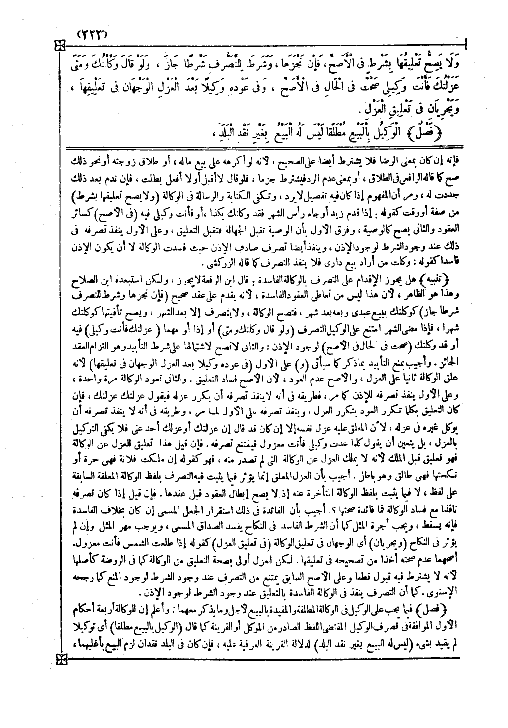 وعلى الأصح السابق يمتنع من التصرف عند وجود الشرط لوجود المنع كما رجحه الإسنوي كما أن التصرف ينفذ في الوكالة الفاسدة بالتعليق عند وجود الشرط لوجود الإذن