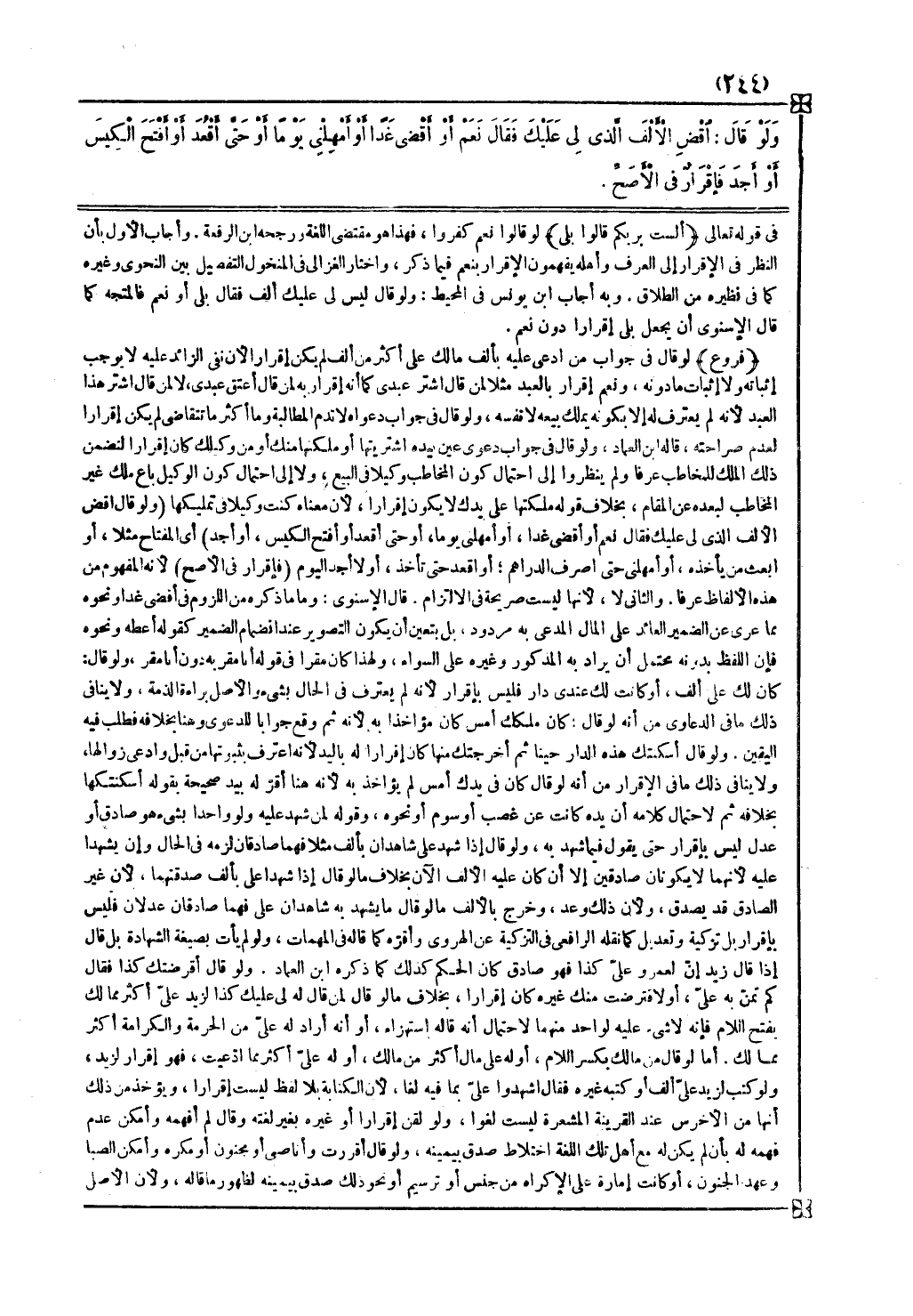 فروع لو قال في جواب من ادعى عليه بألف ما لك علي أكثر من ألف لم يكن إقرارا لأن نفي الزائد عليه لا يوجب إثباته ولا إثبات ما دونه ونعم إقرار بالعبد مثلا لمن قال اشتر عبدي كما أنه إقرار به لمن قال أعتق عبدي لا لمن قال اشتر هذا العبد لأنه لم يعترف له إلا بكونه يملك بيعه لا نفسه