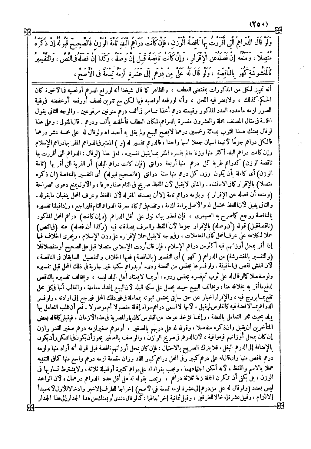 (و) المعتبر في الدراهم المقر بها دراهم الإسلام وإن كانت دراهم البلد أكثر منها وزنا ما لم يفسره المقر بما يقبل تفسيره فعلى هذا (لو قال الدراهم التي أقررت بها ناقصة الوزن) كدراهم طرية كل درهم منها أربعة دوانق (فإن كانت دراهم البلد) أو القرية التي أقر بها (تامة الوزن) أي كاملة بأن يكون وزن كل درهم منها ستة دوانق (فالصحيح قبوله) أي التفسير بالناقصة (إن ذكره متصلا) بالإقرار كما في الاستثناء