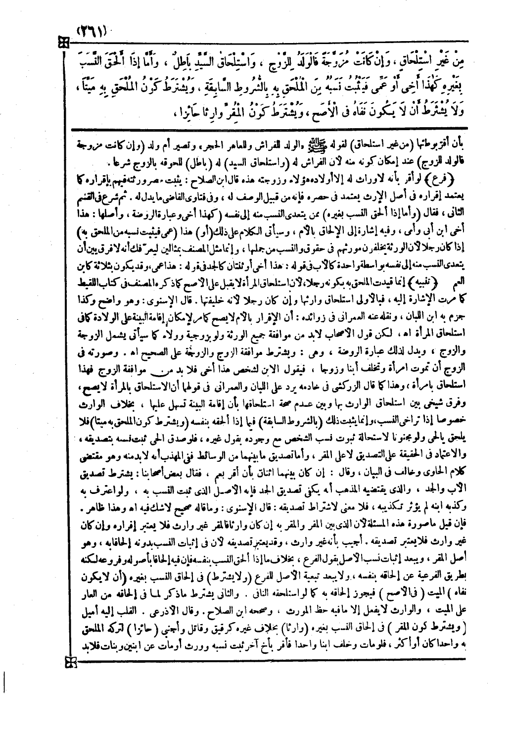 وصورته في الزوج أن تموت امرأة وتخلف ابنا وزوجا فيقول الابن لشخص هذا أخي فلا بد من موافقة الزوج فهذا استلحاق بامرأة وهذا كما قال الزركشي في خادمه يرد على اللبان و العمراني في قولهما إن الاستلحاق بالمرأة لا يصح