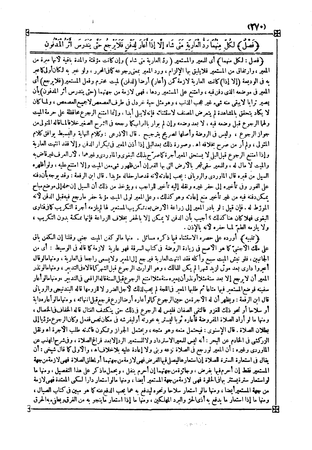 تنبيه أورد على حصره الاستثناء فيما ذكره مسائل منها ما لو كفن الميت أجنبي وقلنا إن الكفن باق على ملك الأجنبي كما هو الأصح في زيادة الروضة في كتاب السرقة فهو عارية لازمة كما قاله في الوسيط أي من الجانبين فلو نبش الميت سبع وأكله فقد انتهت العارية فيرجع إلى المعير ولا يسمى راجعا في العارية