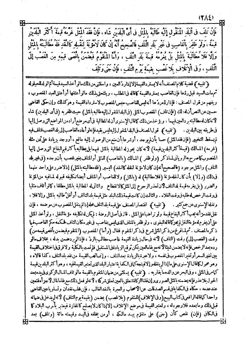 تنبيه يستثنى من ضمان المتقوم بالقيمة ما لو تلف المال الزكوي في يده بعد الحول بلا عذر فإنه يضمنه بالمثل الصوري وإن قلنا الزكاة تتعلق بالعين تعلق شركة لأنه لو فعل ذلك مع بقاء المال لأجزأه فتعين عند عدمه حكاه في الكفاية في قسم الصدقات عن الأصحاب