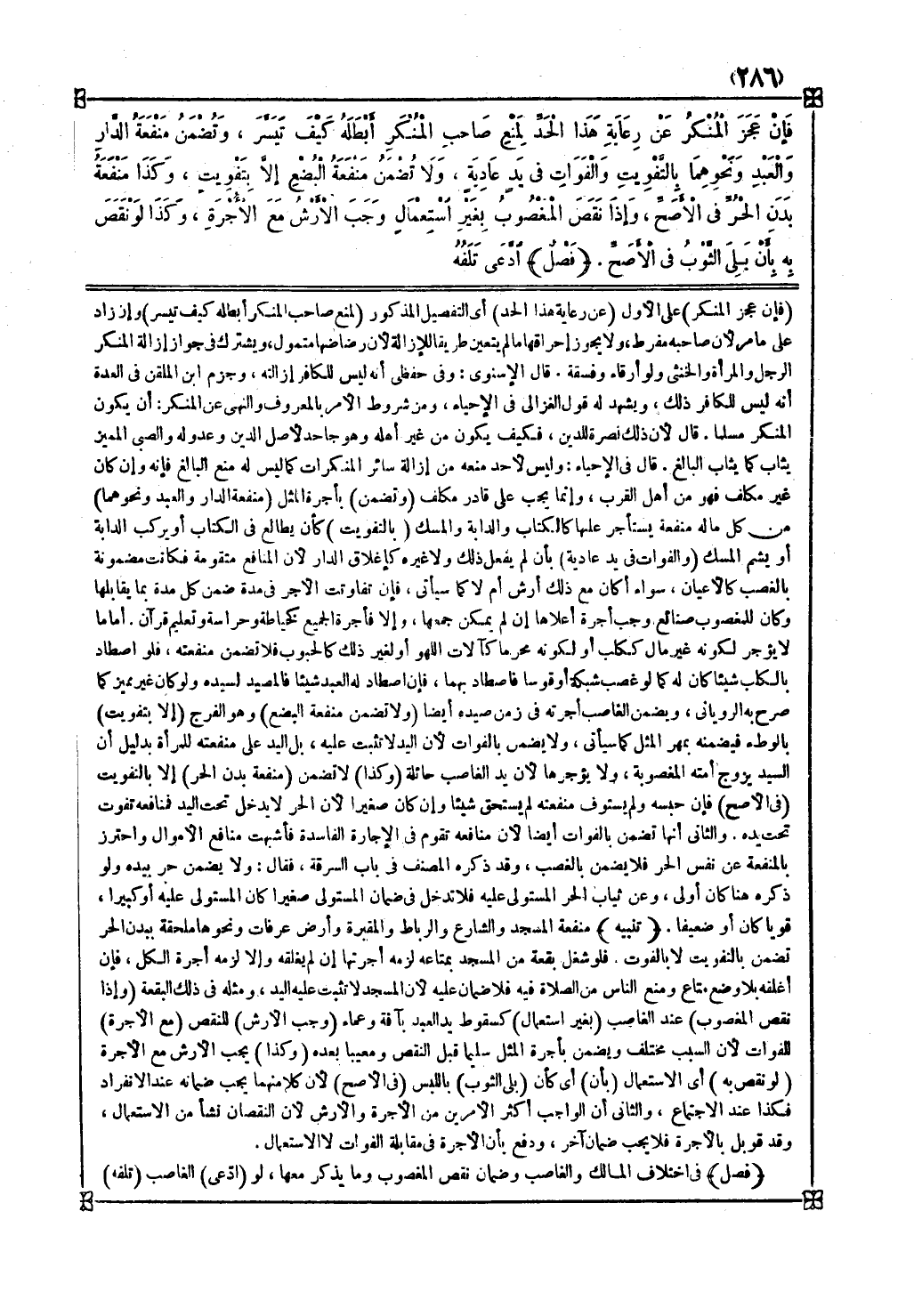 ( وتضمن ) بأجرة المثل ( منفعة الدار والعبد ونحوهما ) من كل ما له منفعة يستأجر عليها كالكتاب والدابة والمسك ( بالتفويت ) كأن يطالع في الكتاب أو يركب الدابة أو يشم المسك ( والفوات في يد عادية ) بأن لم يفعل ذلك ولا غيره كإغلاق الدار لأن المنافع متقومة فكانت مضمونة بالغصب كالأعيان سواء أكان مع ذلك أرش أم لا كما سيأتي