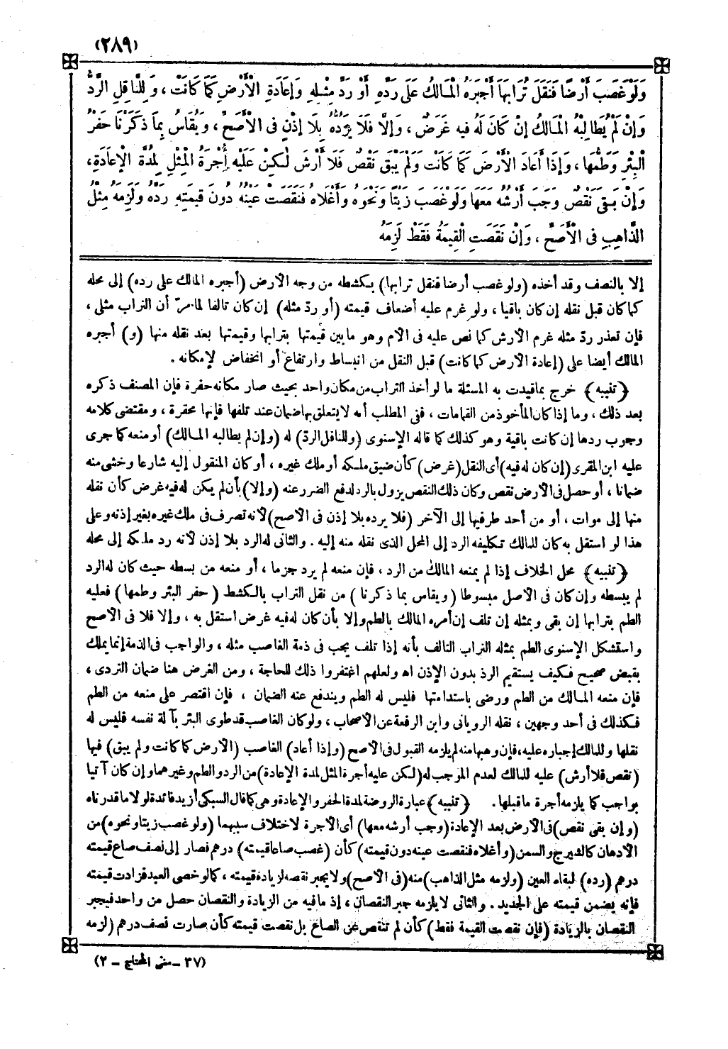 واستشكل الإسنوي الطم بمثله التراب التالف بأنه إذا تلف يجب في ذمة الغاصب مثله والواجب في الذمجة إنما يملك بقبض صحيح فكيف يستقيم الرد بدون الإذن اه
