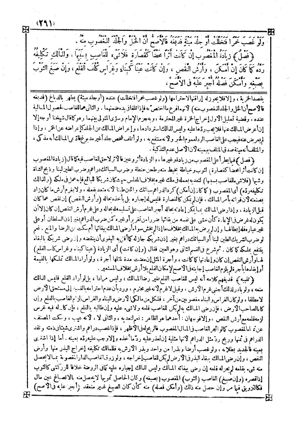 فصل فيما يطرأ على المغصوب من زيادة وغيرها والزيادة أثر وعين فالأثر لاحق للغاصب فيه كما قال ( زيادة المغصوب إن كانت أثرا محضا كقصارة ) لثوب وخياطة بخيط منه وطحن حنطة وضرب السبائك دراهم وضرب الطين لبنا وذبح الشاة وشيها