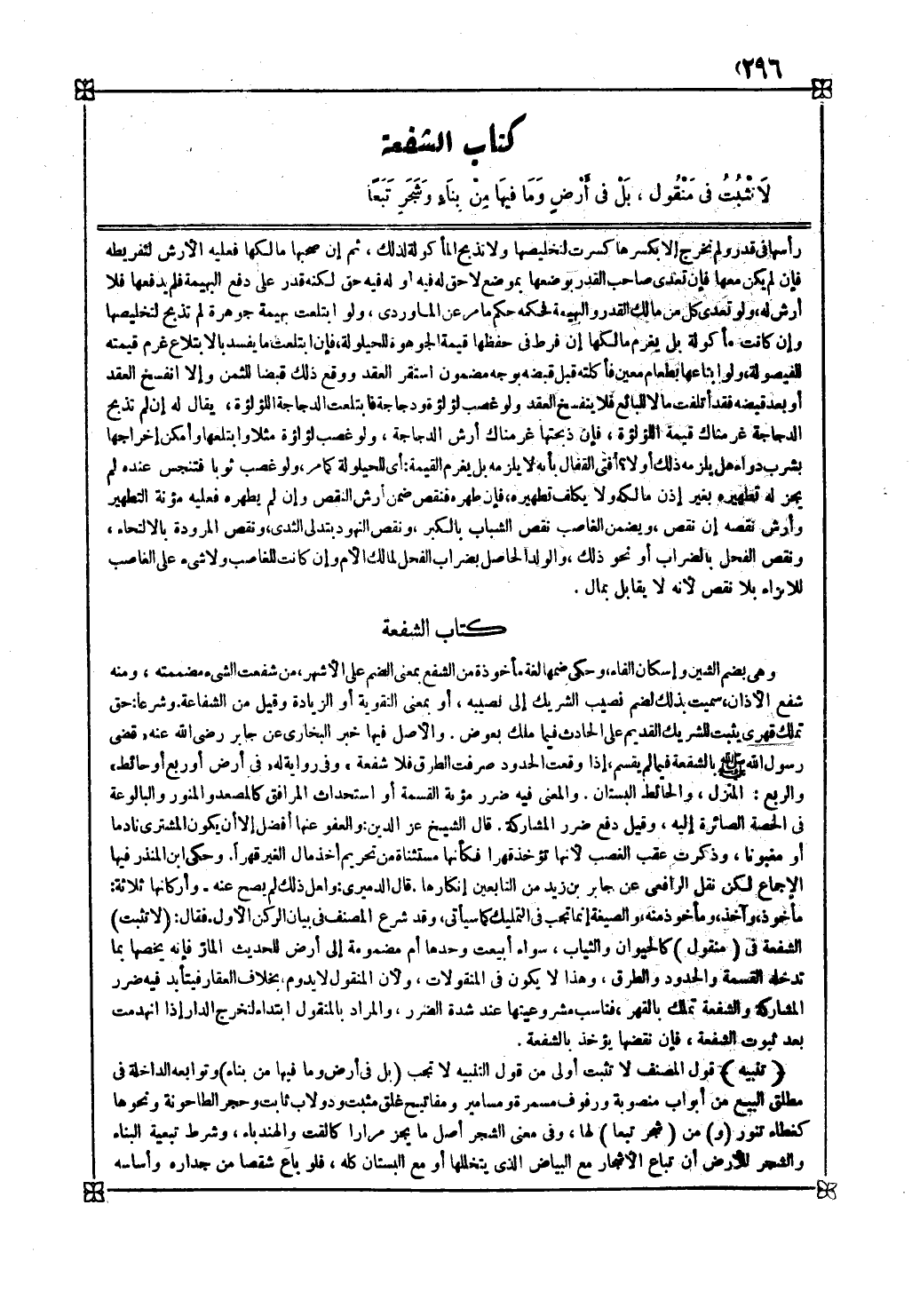 والأصل فيها خبر البخاري عن جابر رضي الله عنه قضى رسول الله صلى الله عليه وسلم بالشفعة فيما لم يقسم فإذا وقعت الحدود وصرفت الطرق فلا شفعة وفي رواية له في أرض أو ربع أو حائط والربع المنزل والحائط البستان