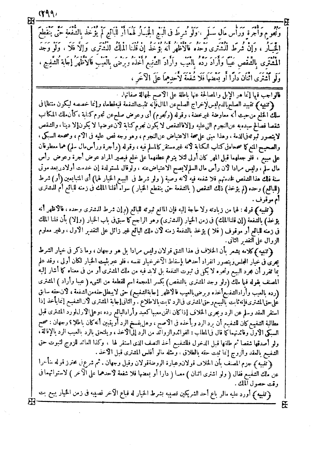 تنبيه أورد عليه ما لو باع أحد الشريكين نصيبه بشرط الخيار له فباع الآخر نصيبه في زمن الخيار بيع بت