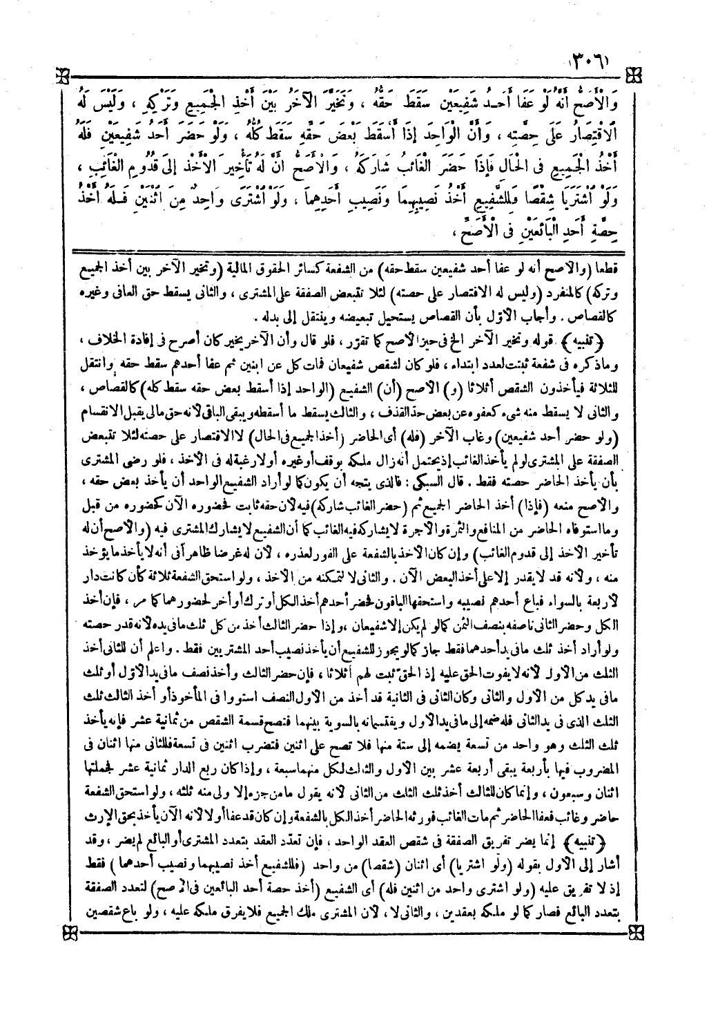 ( ولو حضر أحد شفيعين ) وغاب الآخر ( فله ) أي الحاضر ( أخذ الجميع في الحال ) لا الاقتصار على حصته لئلا تتبعض الصفقة على المشتري لو لم يأخذ الغائب إذ يحتمل أنه زال ملكه بوقف أو غيره أو لا رغبة له في الأخذ