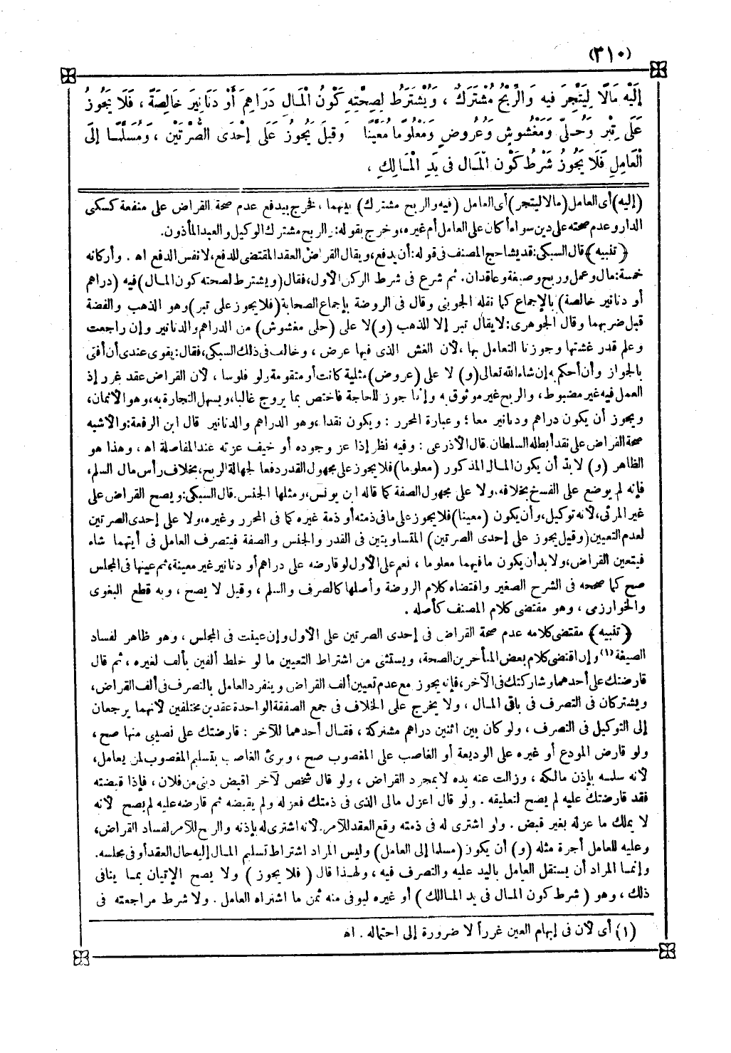 ( و ) أن يكون ( مسلما إلى العامل ) وليس المراد اشتراط تسليم المال إليه حال العقد أو في مجلسه وإنما المراد أن يستقل العامل باليدعليه والتصرف فيه ولهذا قال ( فلا يجوز ) ولا يصح الإتيان بما ينافي ذلك وهو ( شرط كون المال في يد المالك ) أو غيره ليوفي منه ثمن ما اشتراه العامل