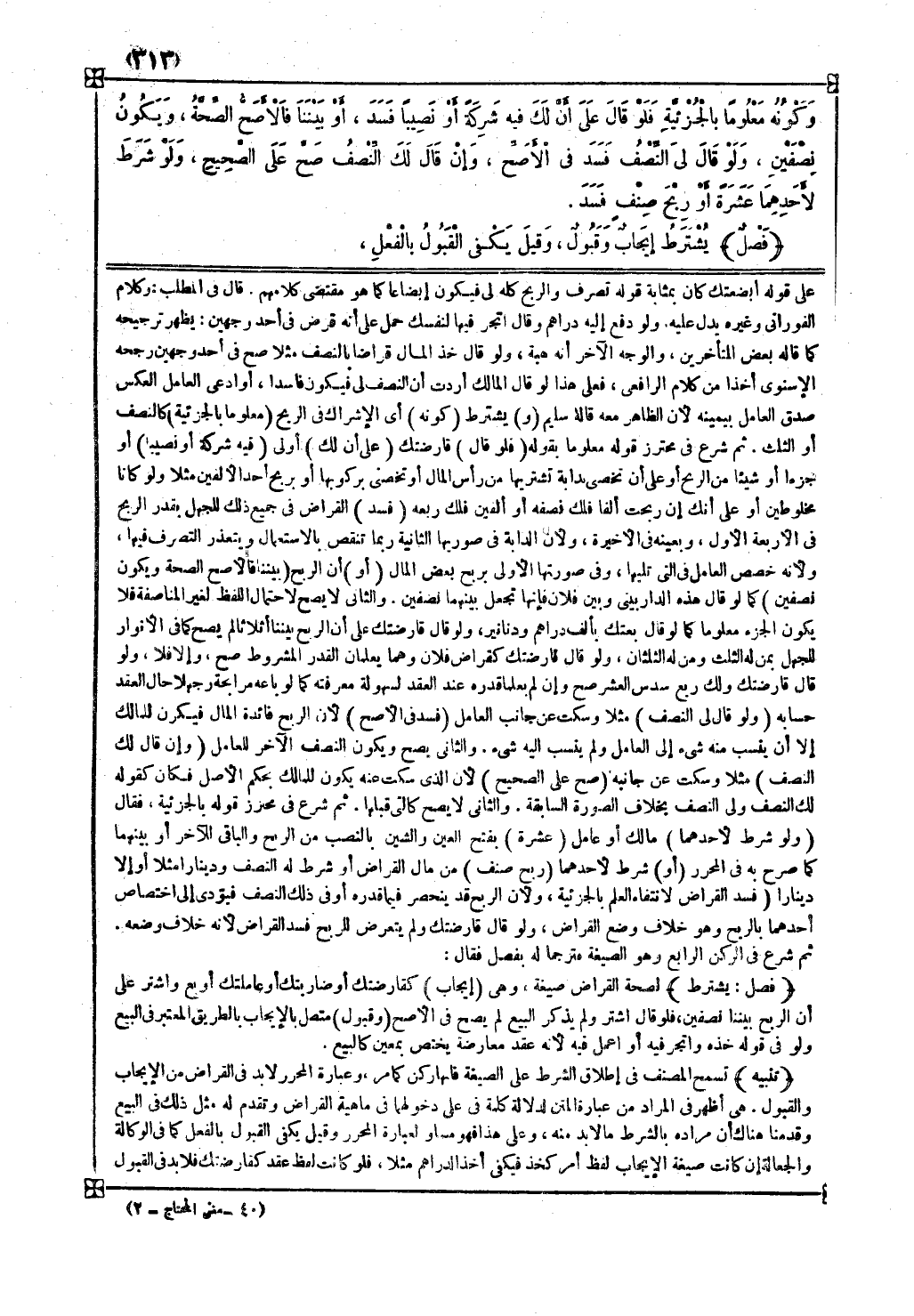 (وقبول) متصل بالإيجاب بالطريق المعتبر في البيع ولو في قوله خذه واتجر فيه أو اعمل فيه لأنه عقد معاوضة يختص بمعين كالبيع