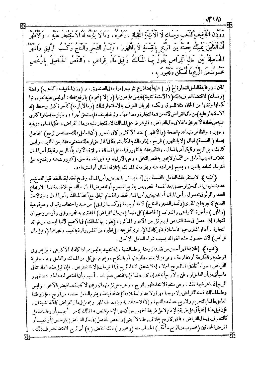 تنبيه لا يستقر ملك العامل بالقسمة بل إنما يستقر بتنضيض رأس المال وفسخ العقد لبقاء العقد قبل الفسخ مع عدم تنضيض المال حتى لو حصل بعد القسمة نقص جبر بالربح المقسوم أو تنضيض المال والفسخ بلا قسمة المال لارتفاع العقد والوثوق بحصول رأس المال أو تنضيض رأس المال فقط واقتسام الباقي مع أخذ المالك رأس المال