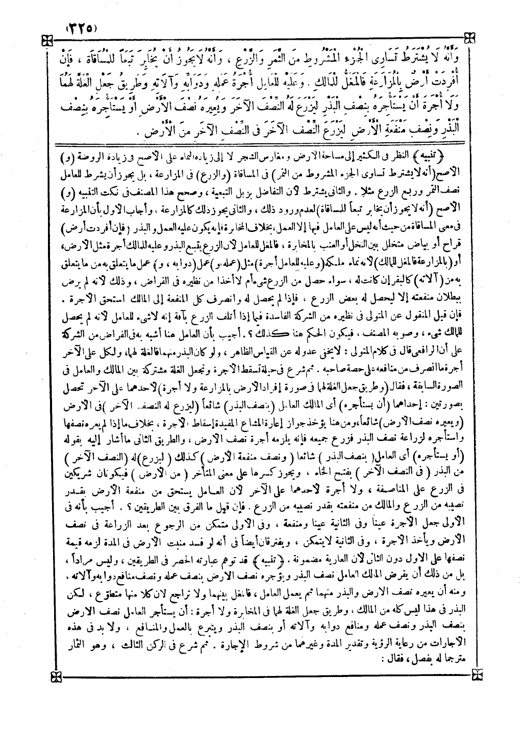 تنبيه قد توهم عبارته الحصر في الطريقين وليس مرادا بل من ذلك أن يقرض المالك العامل نصف البذر ويؤجره نصف الأرض بنصف عمله ونصف منافع دوابه وآلاته ومنه أن يعيره نصف الأرض والبذر منهما ثم يعمل العامل فالمغل بينهما ولا تراجع لأن كلا منها متطوع لكن البذر في هذا ليس كله من المالك