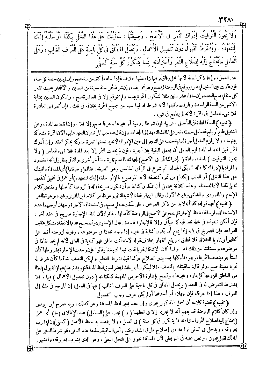 تنبيه قضية كلامه أن الحمل المذكور يجري وإن عقد بغير لفظ المساقاة وهو كذلك وبه صرح ابن يونس وإن كان كلام الروضة قد يفهم أنه لا يجري إلا في لفظها