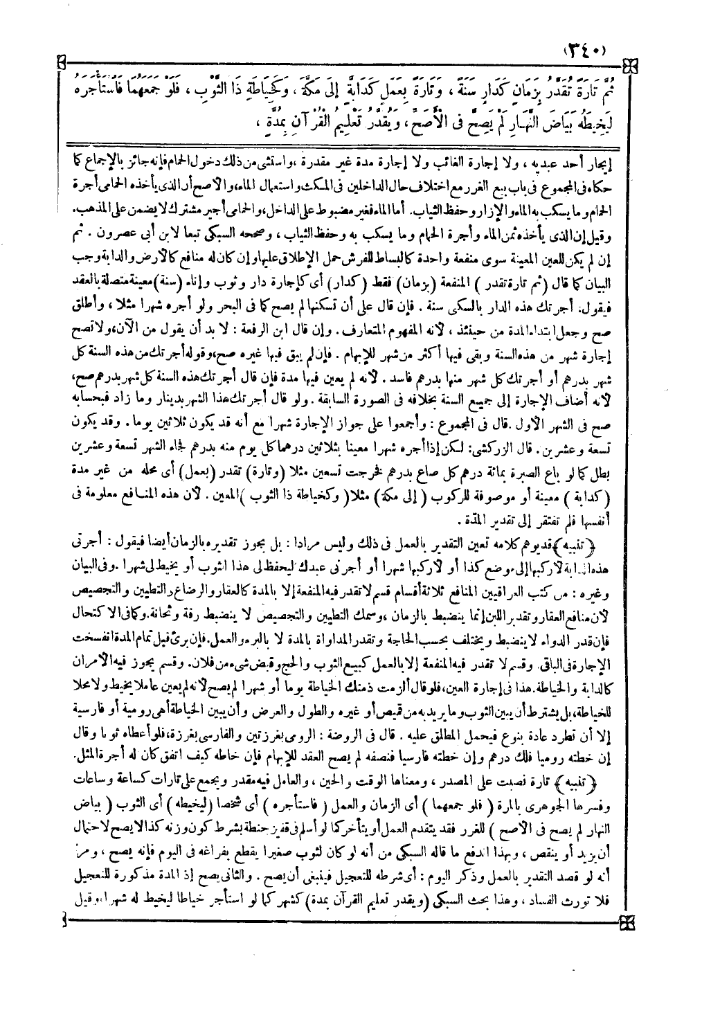 تنبيه قد يوهم كلامه تعين التقدير بالعمل في ذلك وليس مرادا بل يجوز تقديره بالزمان أيضا فيقول أجرني هذه الدابة لأركبها إلى موضع كذا أو لأركبها شهرا أو أجرني عبدك ليحفظ لي هذا الثوب أو يخيط لي شهرا