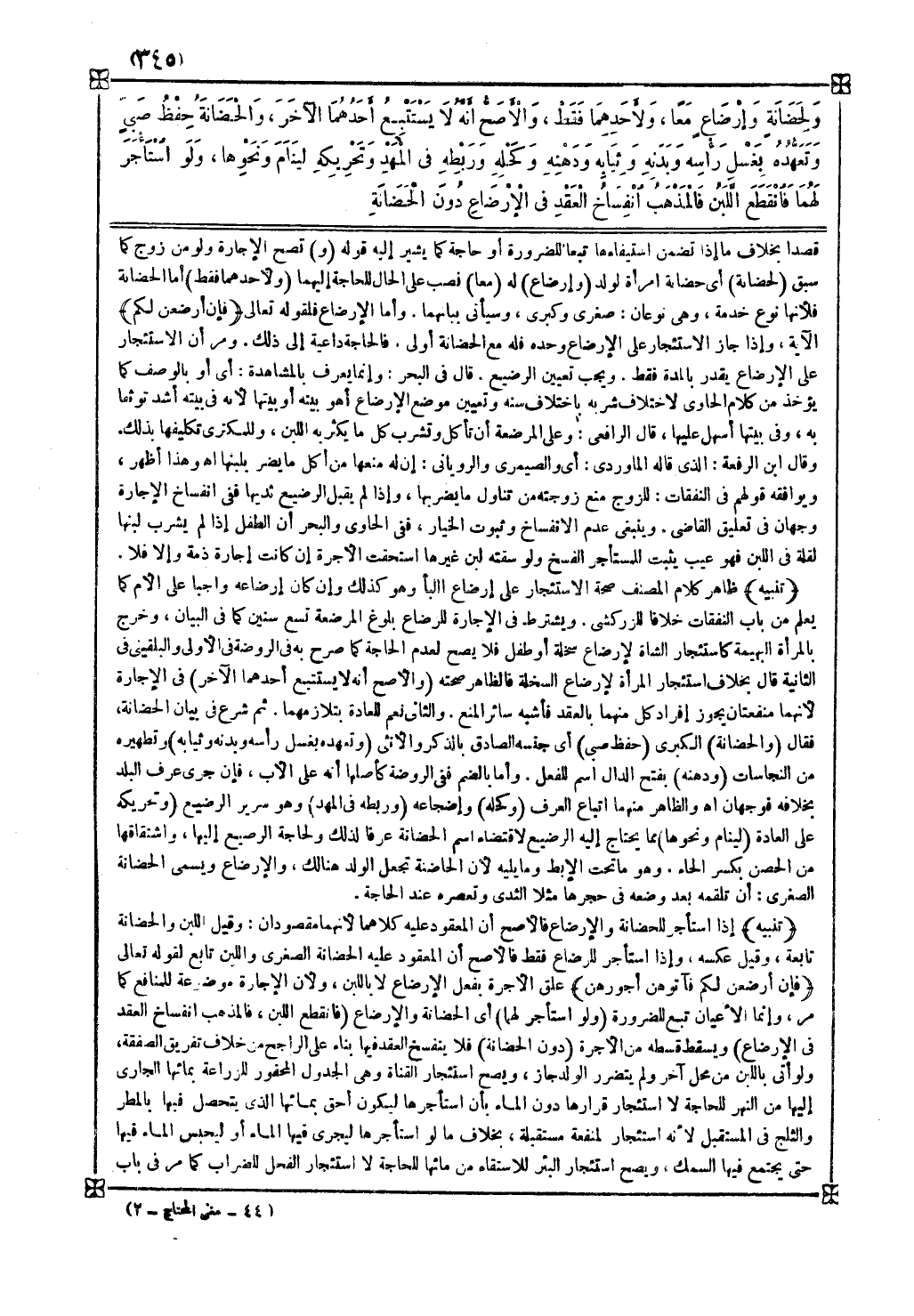 قصدا بخلاف ما إذا تضمن استيفاءها تبعا للضرورة أو حاجة كما يشير إليه قوله ( و ) تصح الإجارة ولو من زوج كما سبق ( لحضانة ) أي حضانة امرأة لولد ( وإرضاع ) له ( معا ) نصب على الحال للحاجة إليهما ( ولأحدهما فقط ) أما الحضانة فلأنها نوع خدمة وهي نوعان صغرى وكبرى وسيأتي بيانهما