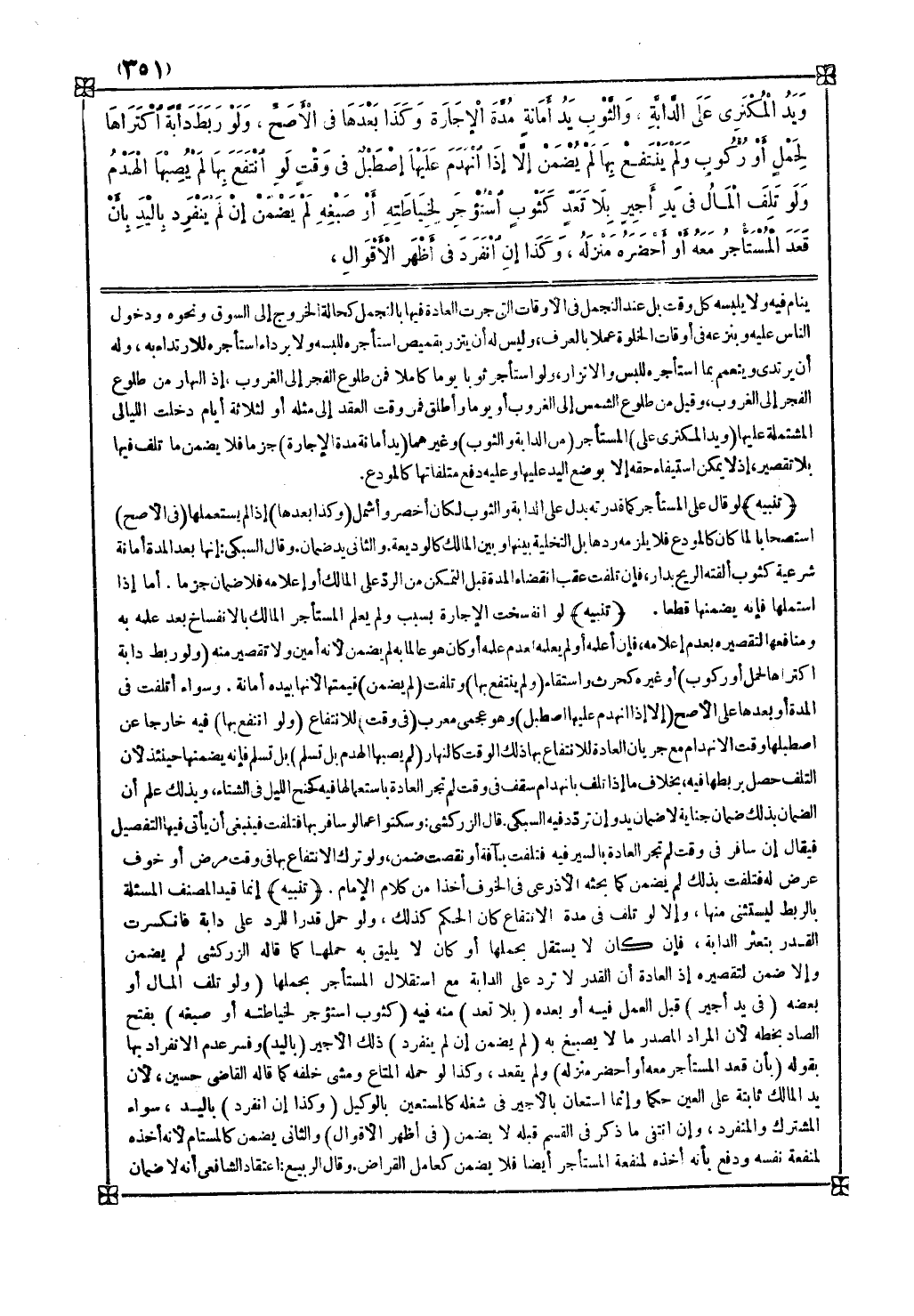 ( ويد المكتري على ) المستأجر من ( الدابة والثوب ) وغيرهما ( يد أمانة مدة الإجارة ) جزما فلا يضمن ما تلف فيها بلا تقصير إذ لا يمكن استيفاء حقه إلا بوضع اليد عليها وعليه دفع متلفاتها كالمودع