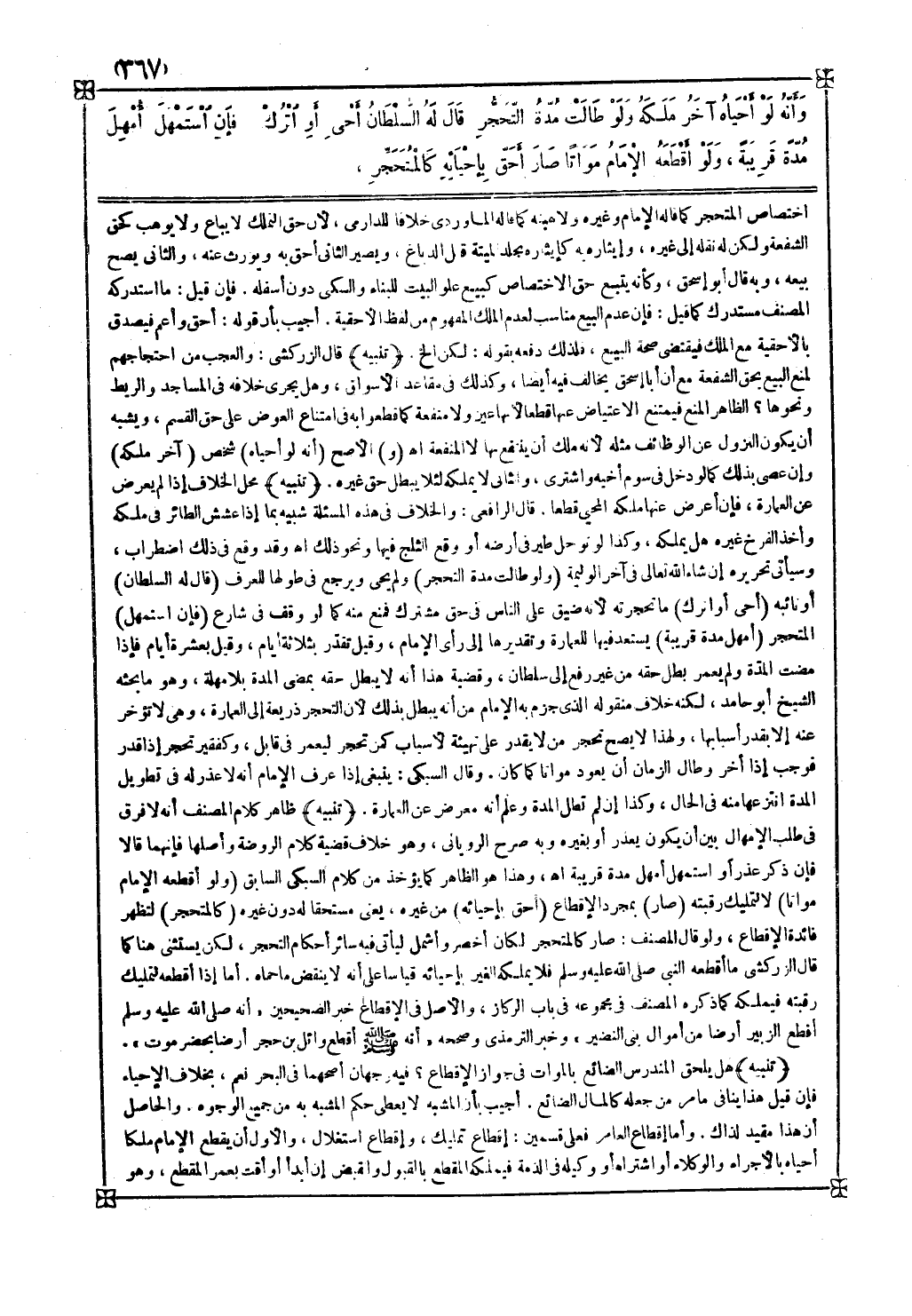 وقضية هذا أنه لا يبطل حقه بمضي المدة بلا مهلة وهو ما بحثه الشيخ أبو حامد لكنه خلاف منقوله الذي جزم به الإمام من أنه يبطل بذلك لأن التحجر ذريعة إلى العمارة وهي لا تؤخر عنه إلا بقدر أسبابها ولهذا لا يصح تحجر من لا يقدر على تهيئة لأسباب كمن تحجر ليعمر في قابل وكفقير تحجر إذا قدر فوجب إذا أخر وطال الزمان أن يعود مواتا كما كان